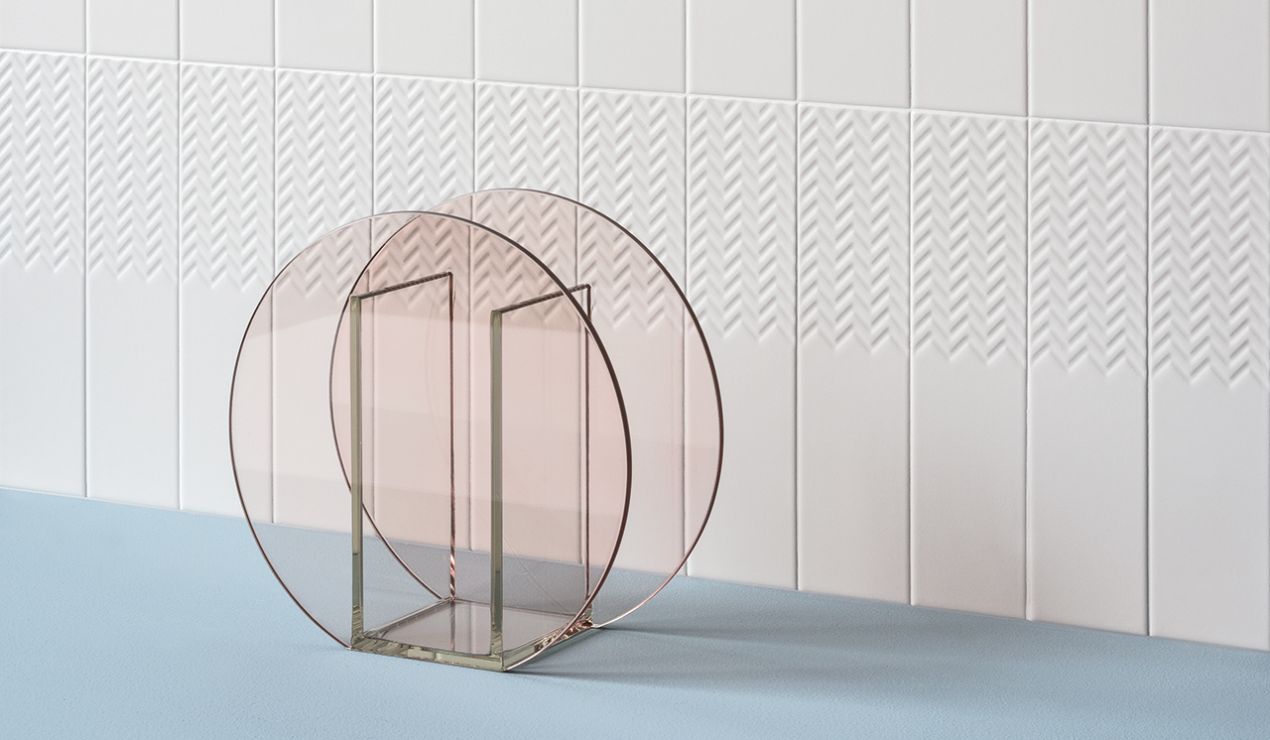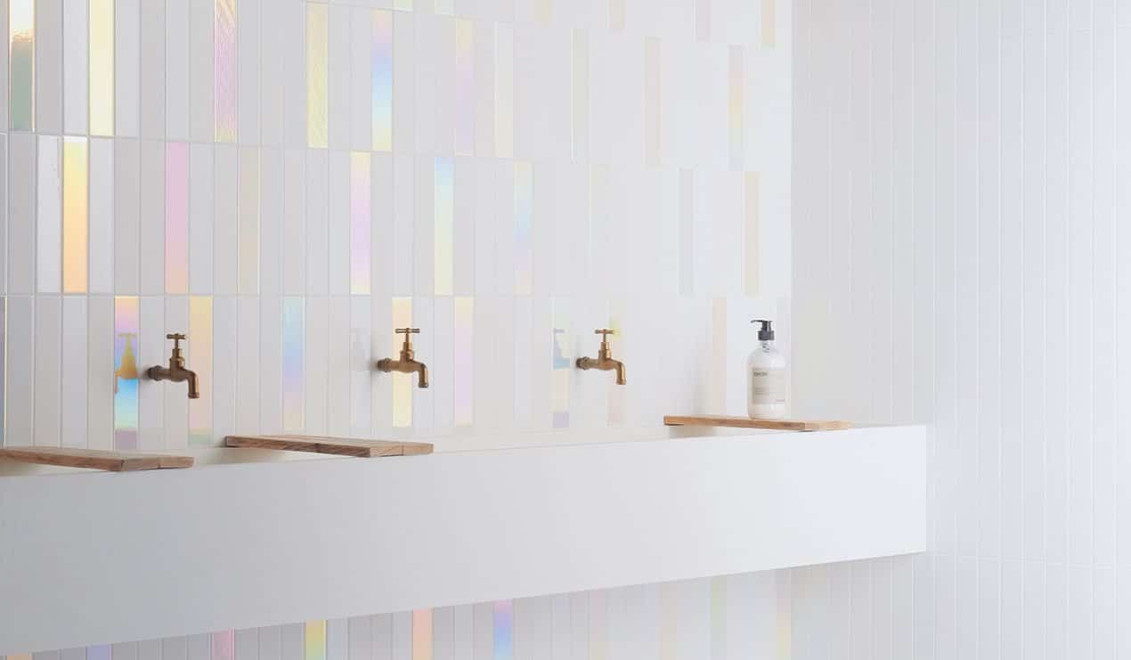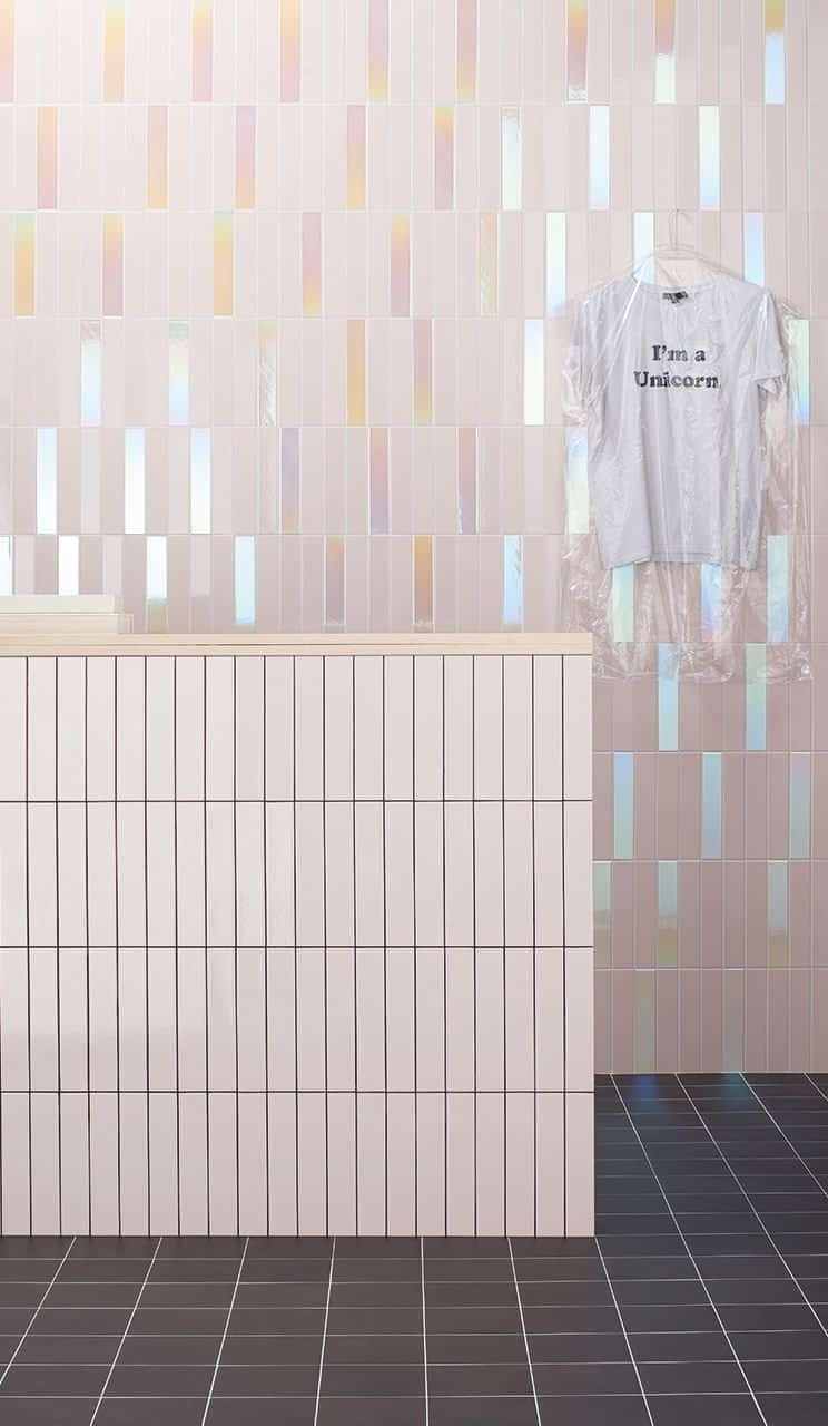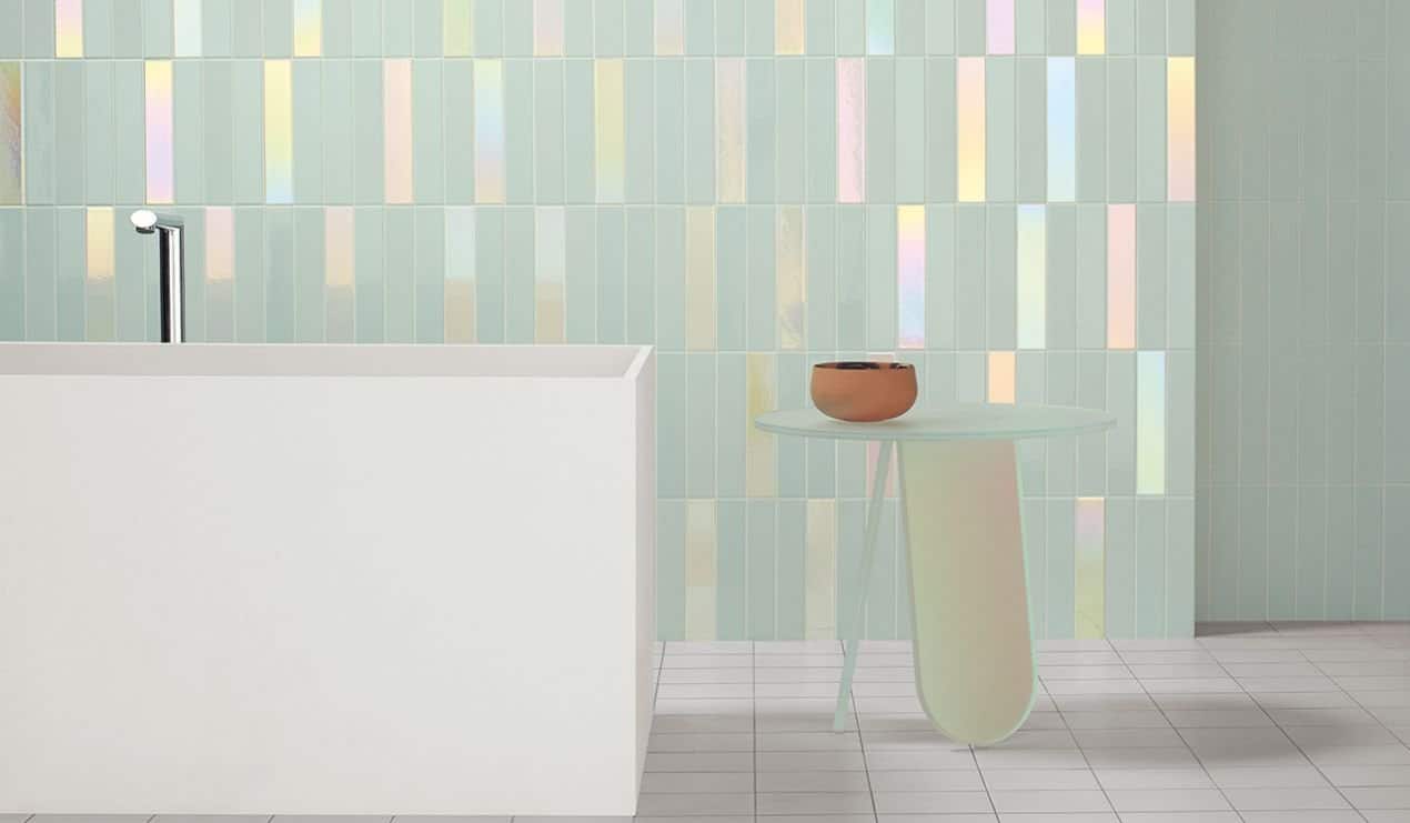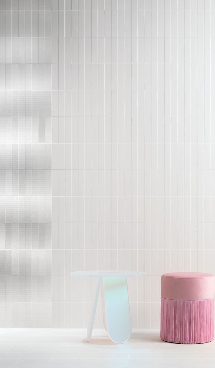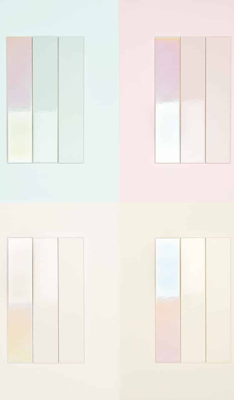 Tillsammans ger de olika ytorna en regnbågsskimrande visuell rytm som omvärderar våra samtida miljöer med kakel.