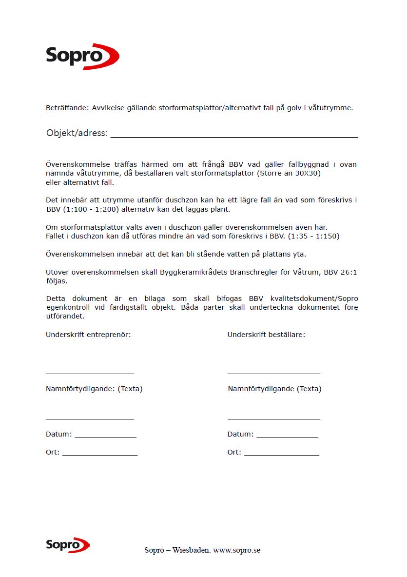 Sopro Avvikelse gällande storformats plattor på golv i våtutrymme