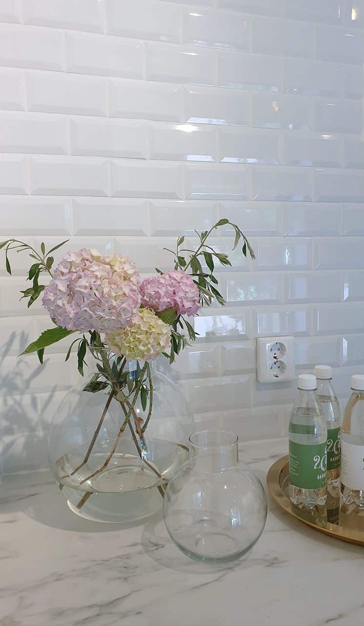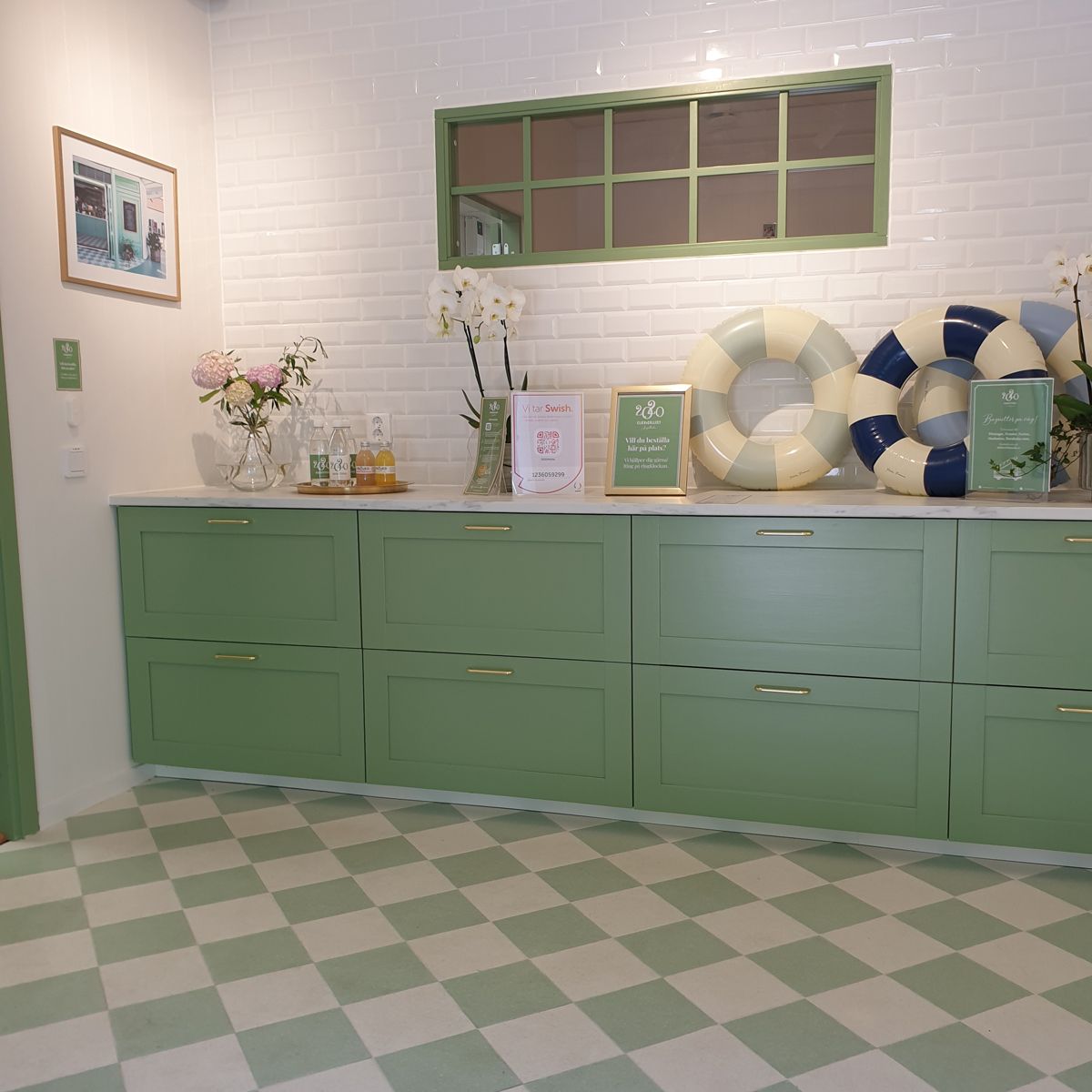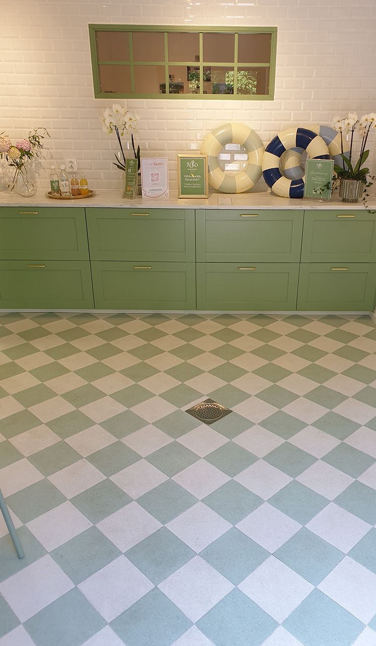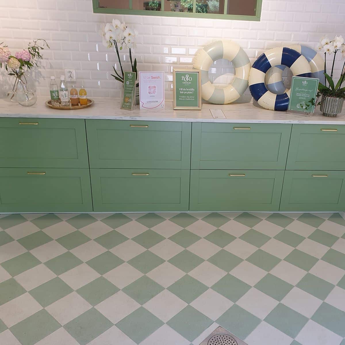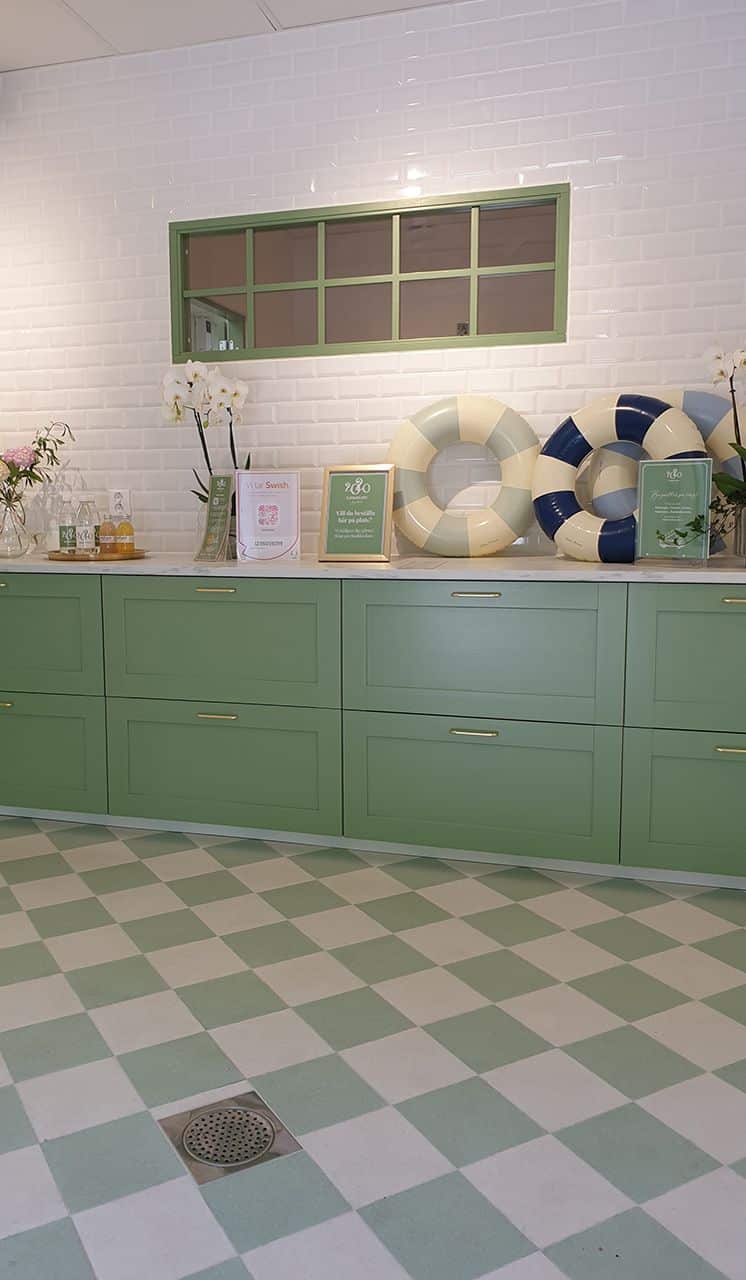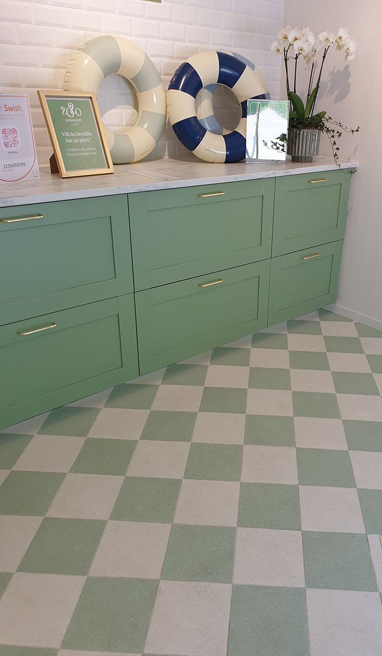 I butiksdelen använder man sig av samma koncept som moder-baguetterian i Mölle, vilket innebär samma vackra schackrutiga golv i de härliga pastellkulörerna Avorio & Acquamarina från den italienska leverantören MIPA. Väggarna matchar golvet med krispigt vita ytor i form av en fasad platta i formatet 7,5×15 från Ce.Si, som ger en bistrokänsla.