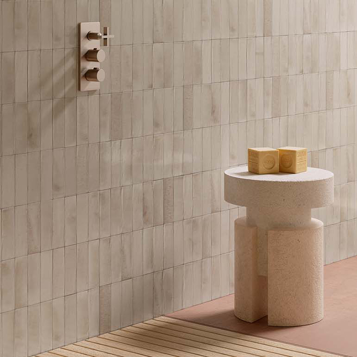 Serien Argile finns i två format 6×25 och 10×10. Med ett stort färgspann och en härlig yta som påminner om handslaget klassiskt kakel fungerar den utmärkt i både små och stora badrum.