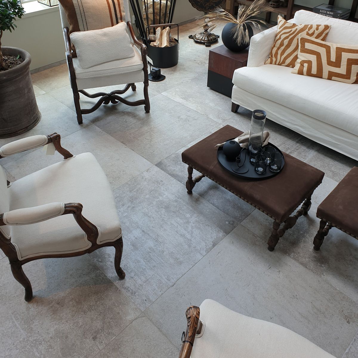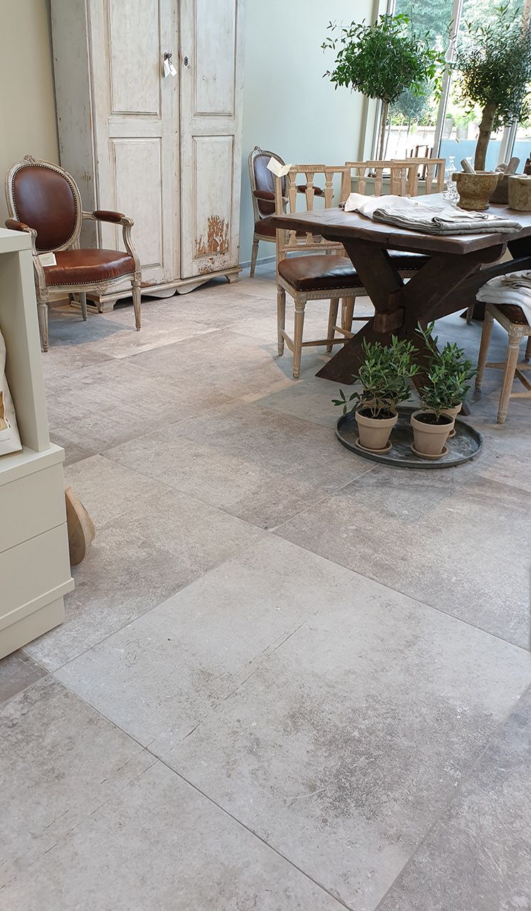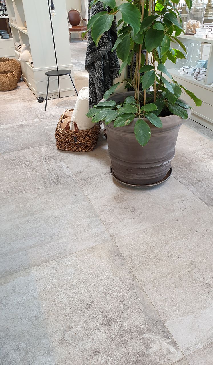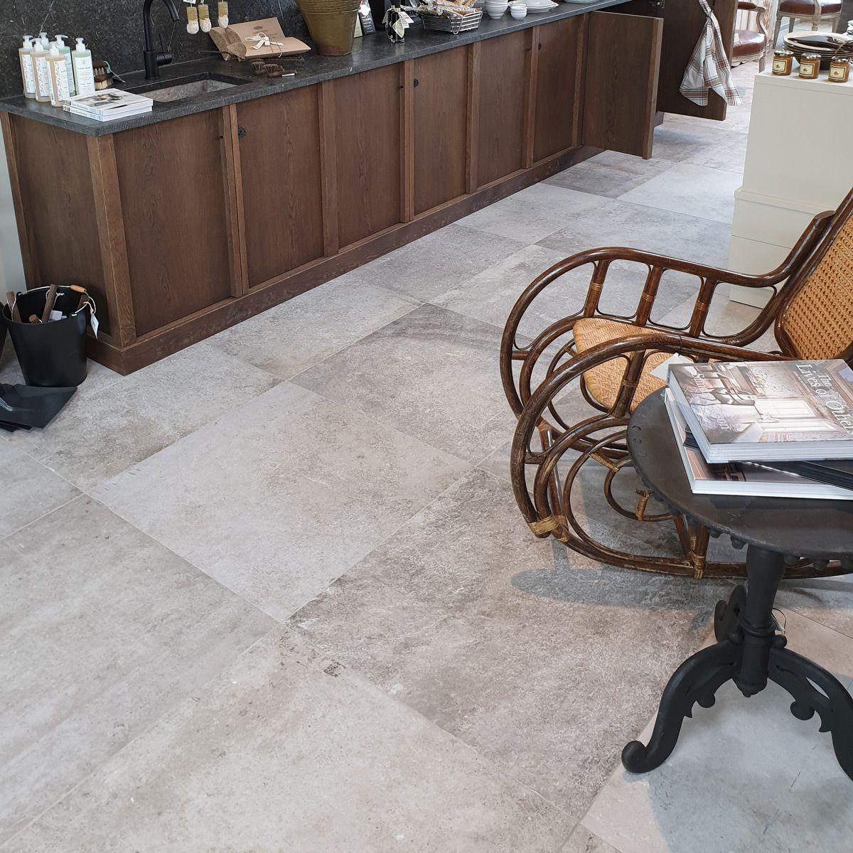 På golvet valde man att lägga La Roche Grey matt i formatet 80×80. En serie som ger en känsla av antik sten i modern tappning, vilket passar väl in i denna butik vars sortiment består av antikviteter i kombination med modern design.