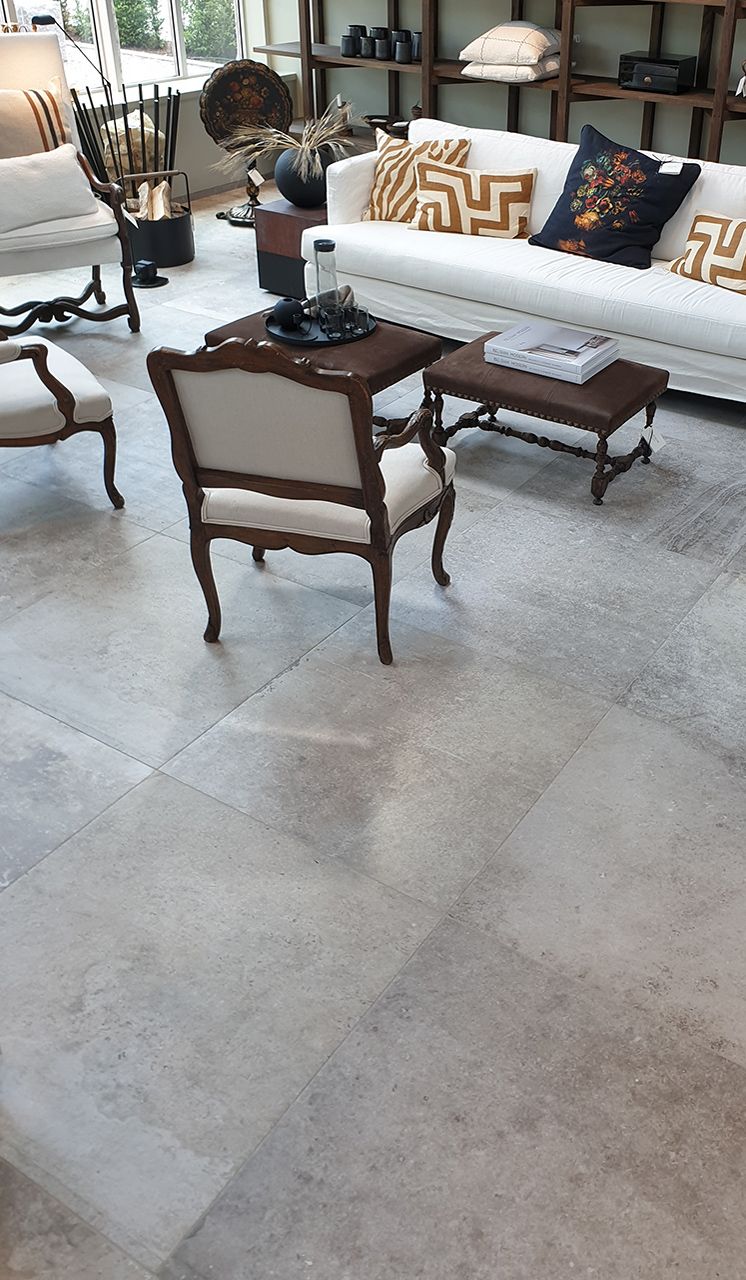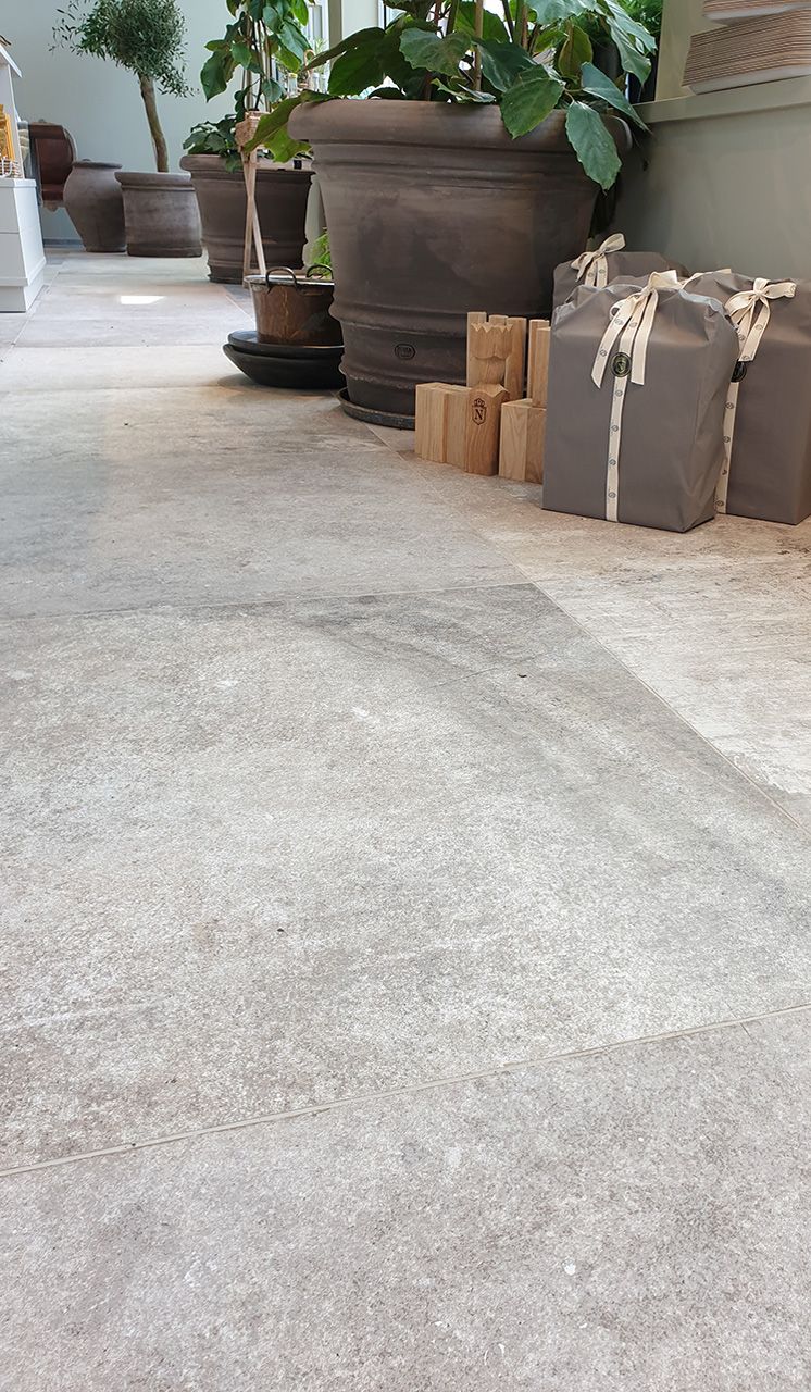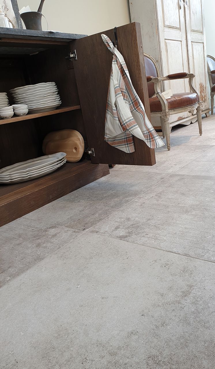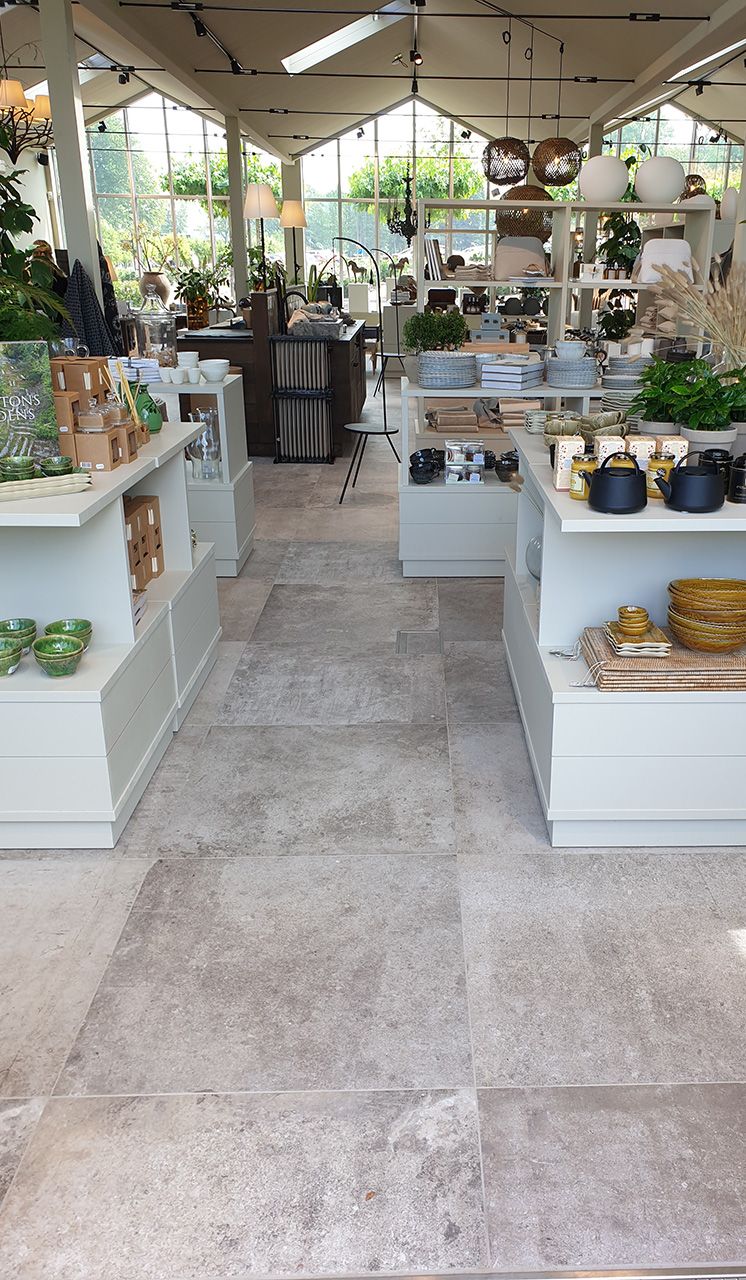 På golvet valde man att lägga La Roche Grey matt i formatet 80×80. En serie som ger en känsla av antik sten i modern tappning, vilket passar väl in i denna butik vars sortiment består av antikviteter i kombination med modern design.