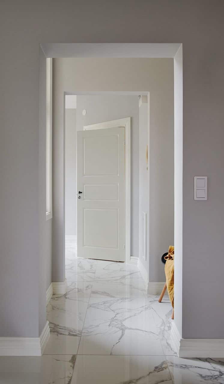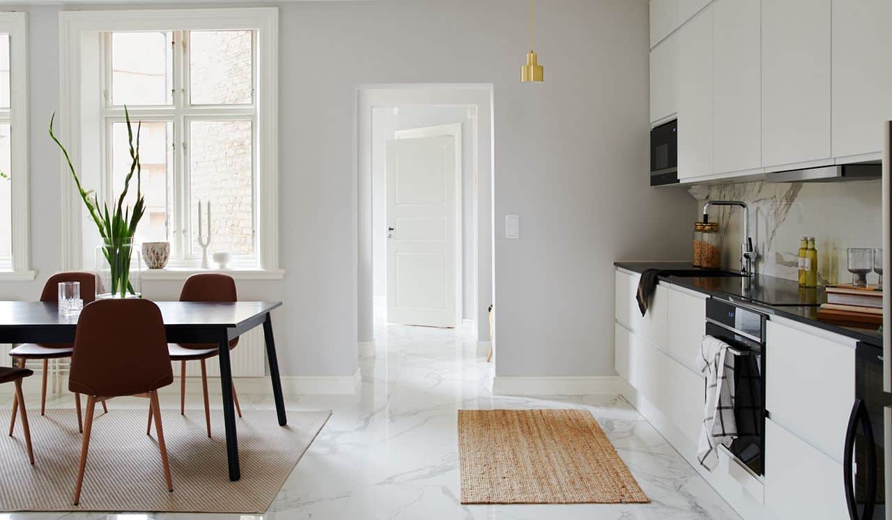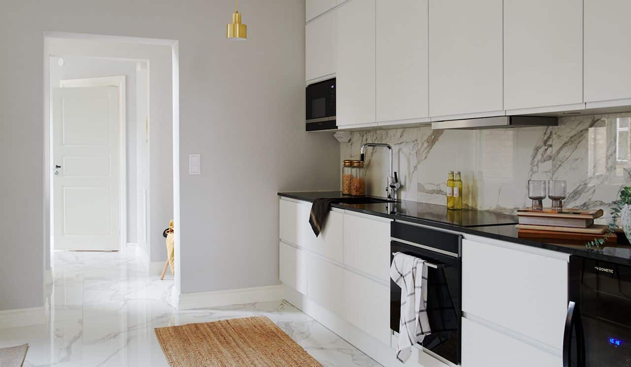 Till denna lägenhet i centrala Helsingborg har man genomgående använt sig av material i marmorlook. Marmor med sin tidlösa stil, som ständigt känns lyxig, ren och avslappnande ger lägenheten ett exklusivt uttryck.