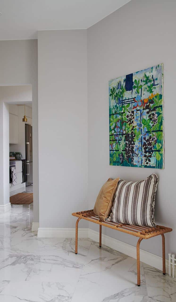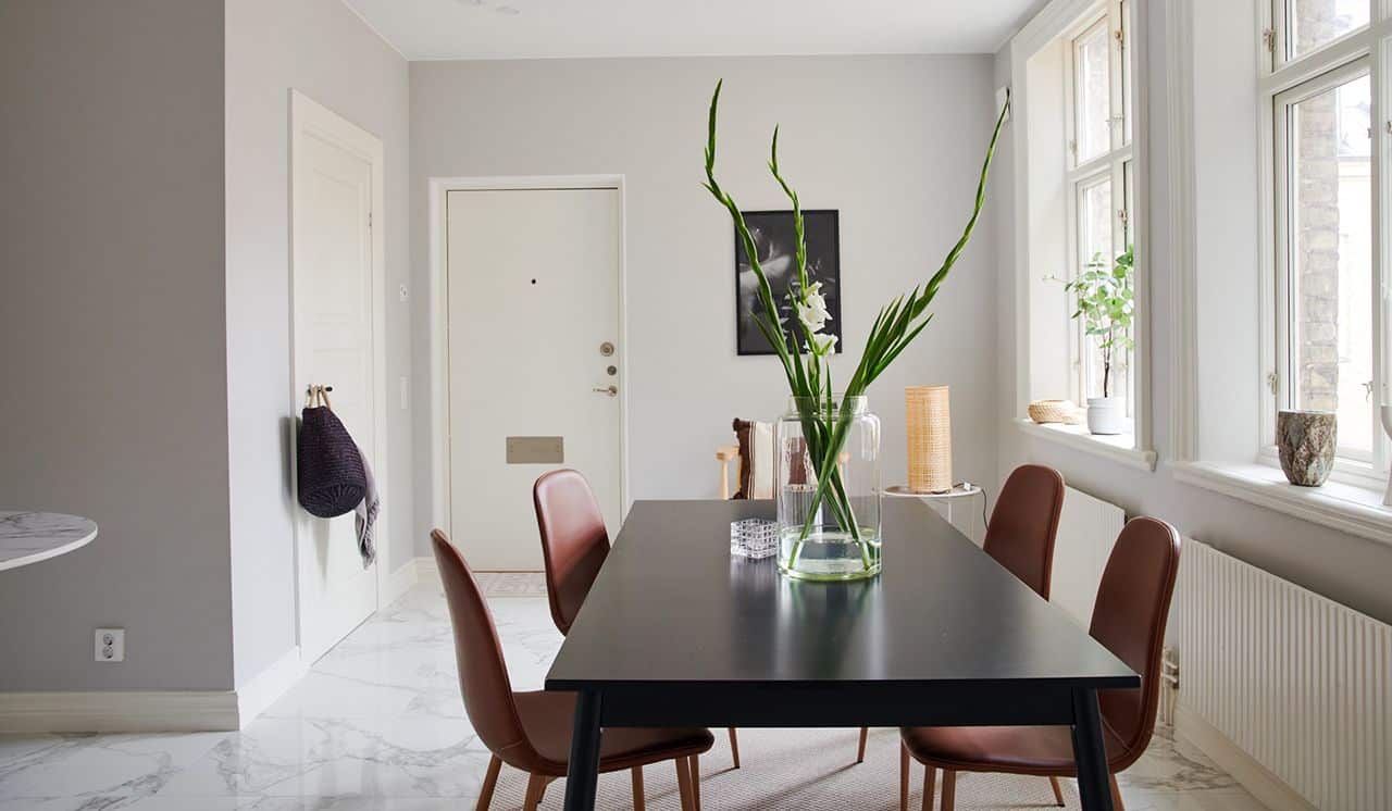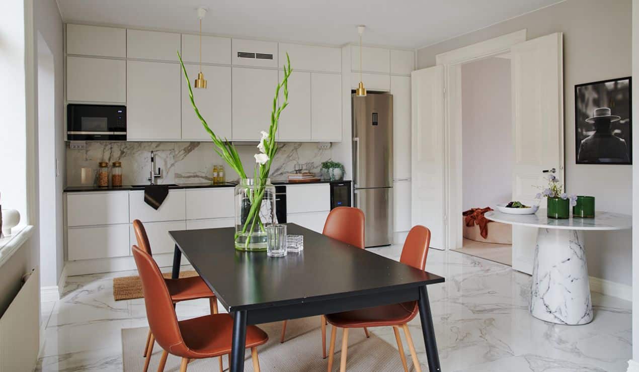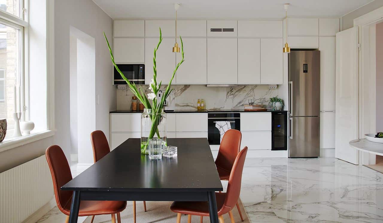 Till denna lägenhet i centrala Helsingborg har man genomgående använt sig av material i marmorlook. Marmor med sin tidlösa stil, som ständigt känns lyxig, ren och avslappnande ger lägenheten ett exklusivt uttryck.