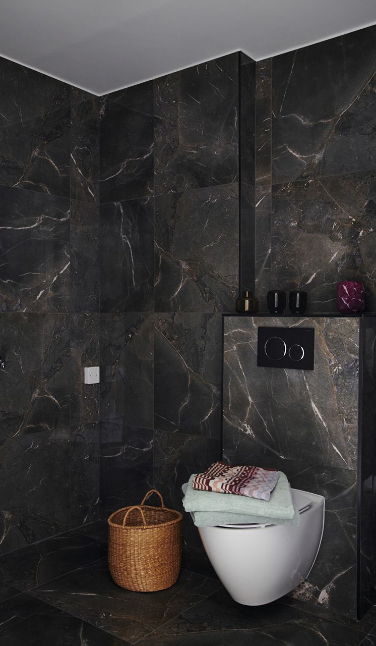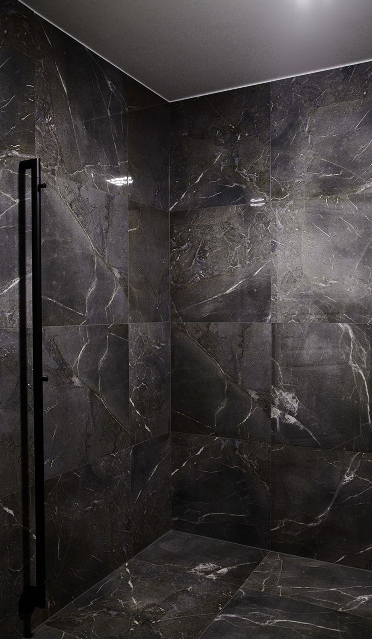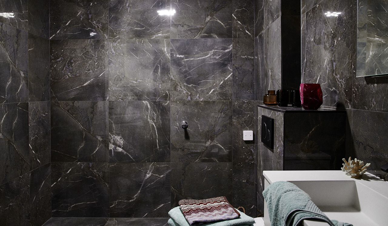 I köket valde man att använda serien Jewels, kulören Statuario Lunensis JW 12 i formatet 60×120 på golv och som stänkskydd. I passagen valde man 60×60. I badrummet gick man över till serien Timeless och den dramatiskt svarta Black deep kulören, format 60×60 på golv och vägg.