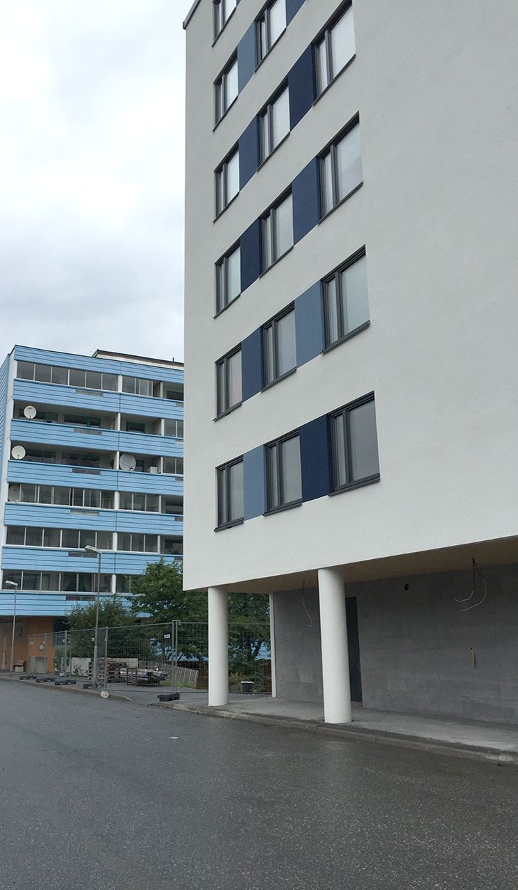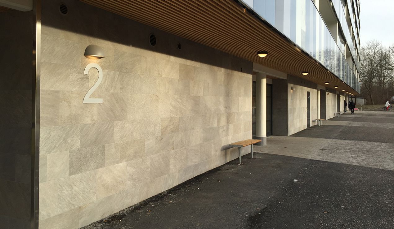 Detta miljonprogram i Upplands Väsby, där man ville rusta upp bland annat fasaderna blev mycket lyckat med granitkeramiken från serien Quarziti 2.0. Man valde i detta projekt att växla mellan tre olika storlekar i löpande förband (300×300, 300×600, 400×600).