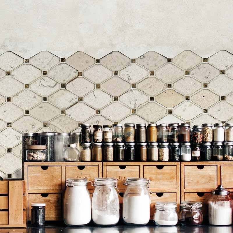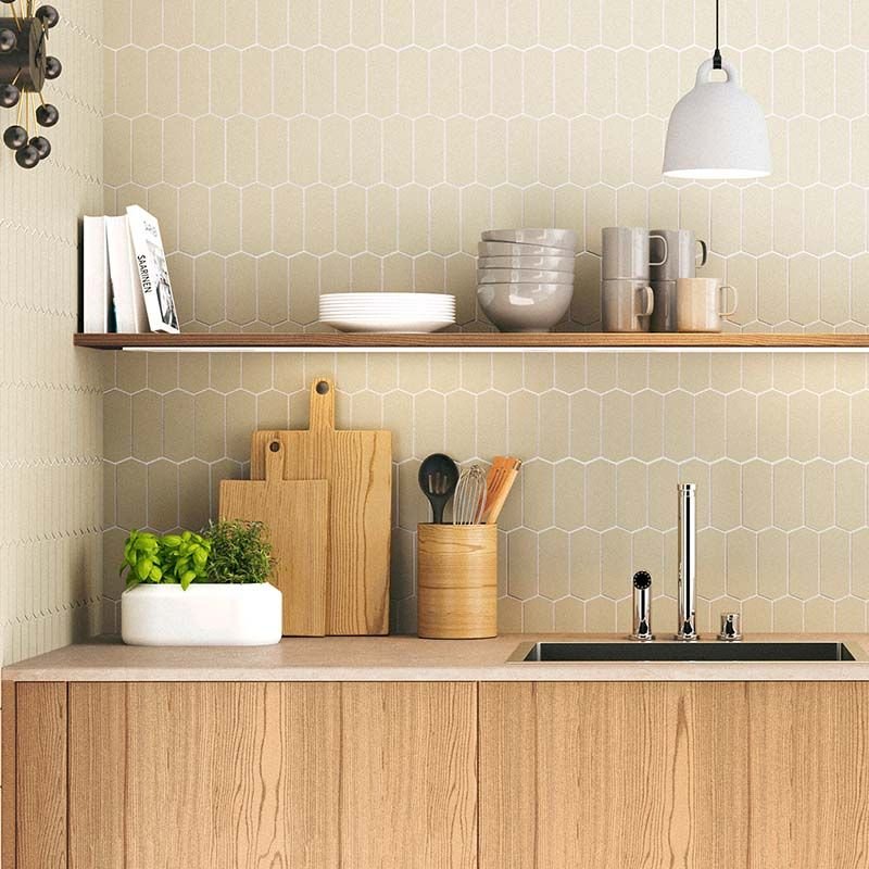 Hexagonformad beige mosaik från Dvothed bidrar till spännande uttryck i hemmets alla rum.