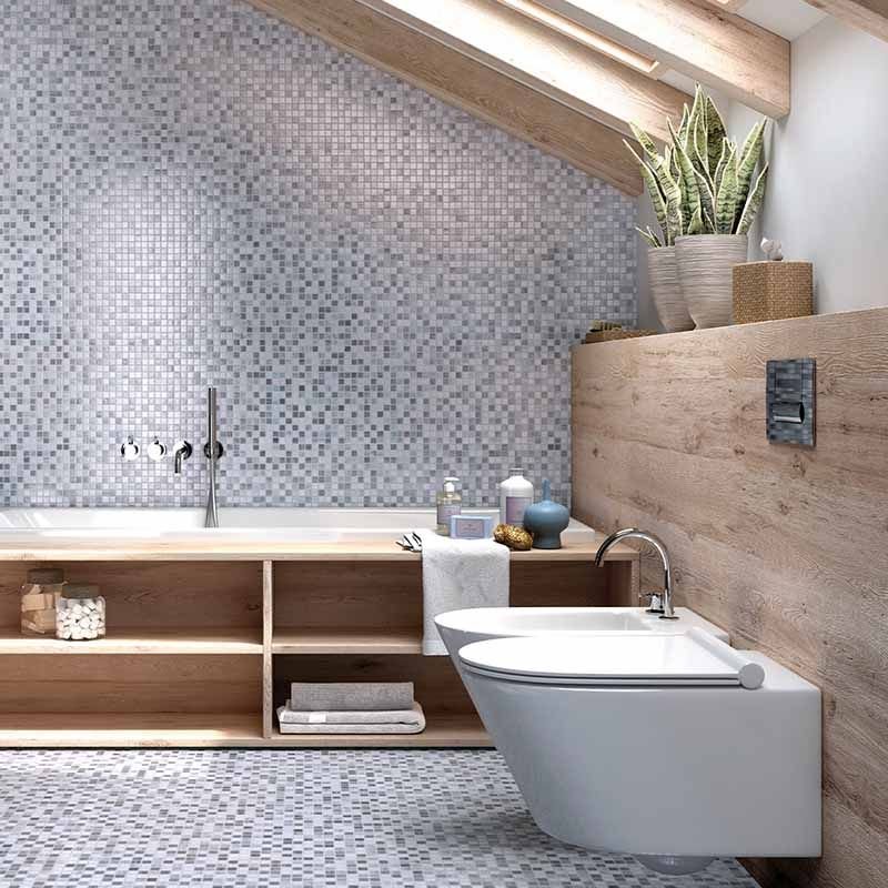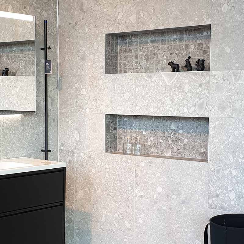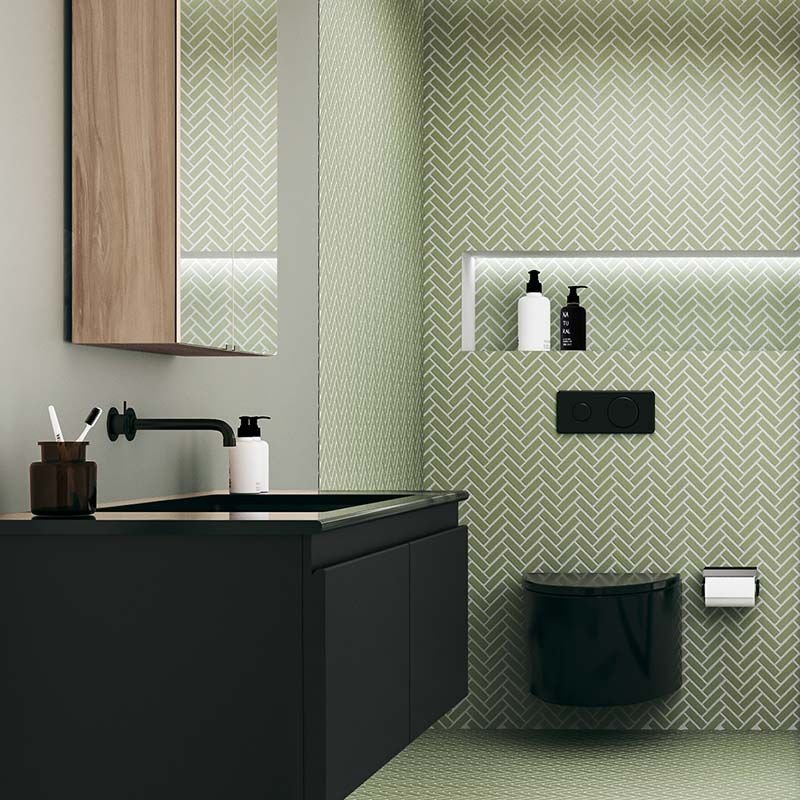 Badrum inrett med serien Norr med en nisch i mosaik från samma serie skapar en vacker dynamik till rummet.