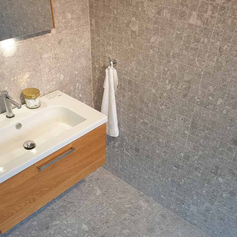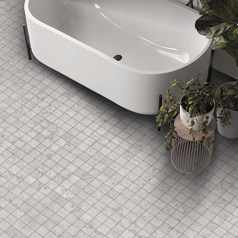 Serien Gotland ger mosaik med en naturtrogen känsla av kalksten som gör sig perfekt i badrum.