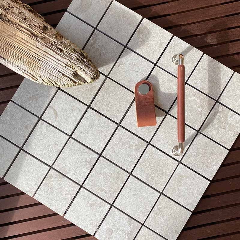 Serien Gotland ger dig mosaik i granitkeramik inspirerad av kalksten och passar både inne och ute.