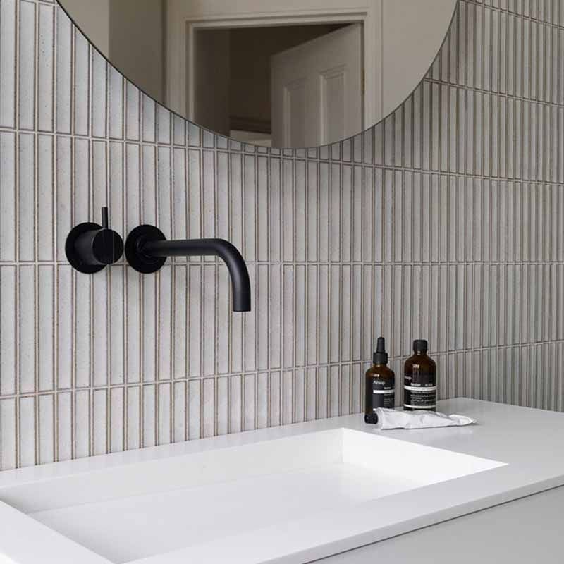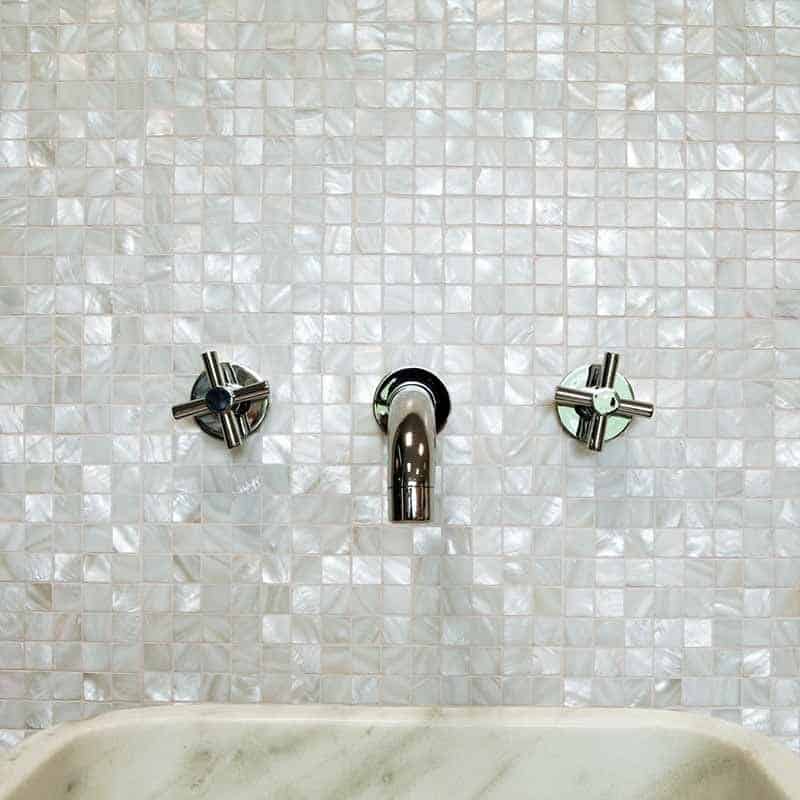 Vit KitKat-mosaik från The Mosaic Factory med en handgjord känsla ger badrummet en smakfull och levande look.