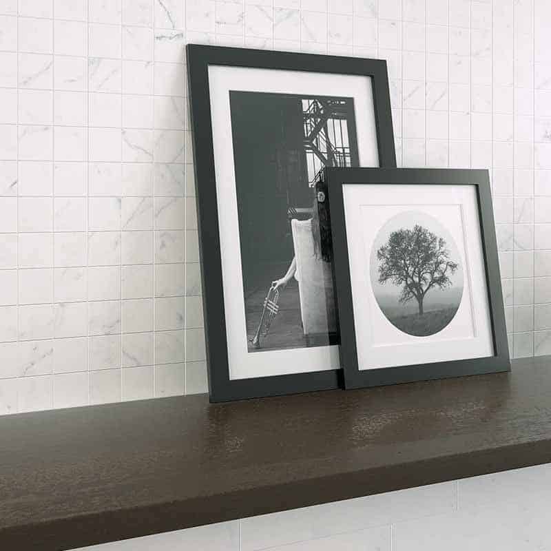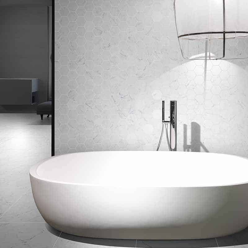 Carrara är en vacker reproduktion av marmor och finns att få som mosaik i både hexagon och rektangulära plattor.