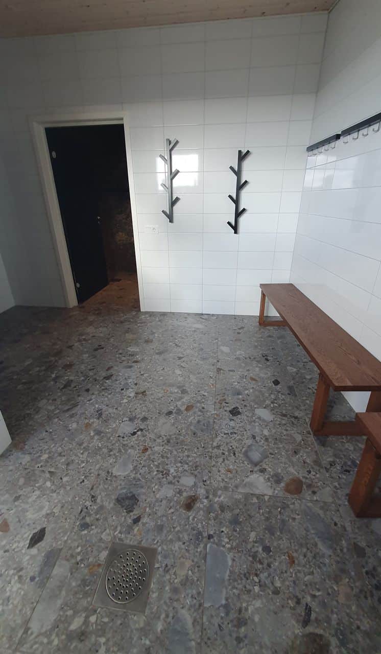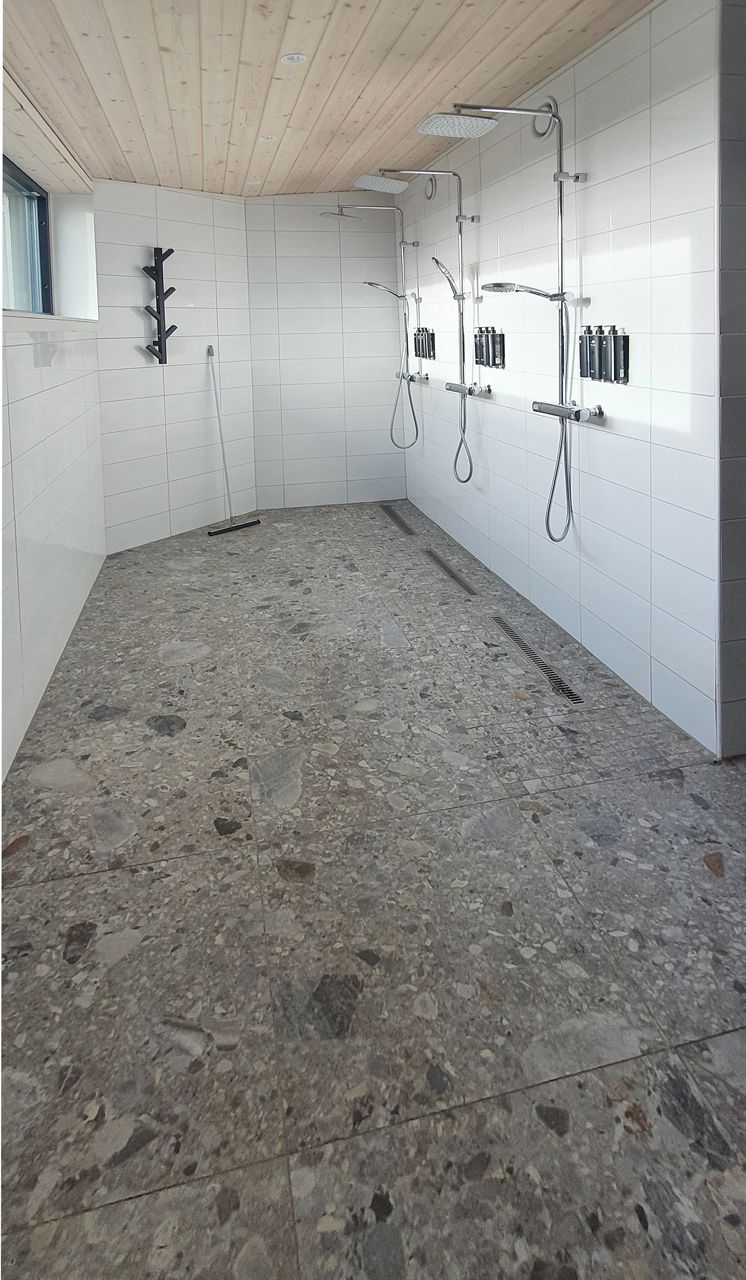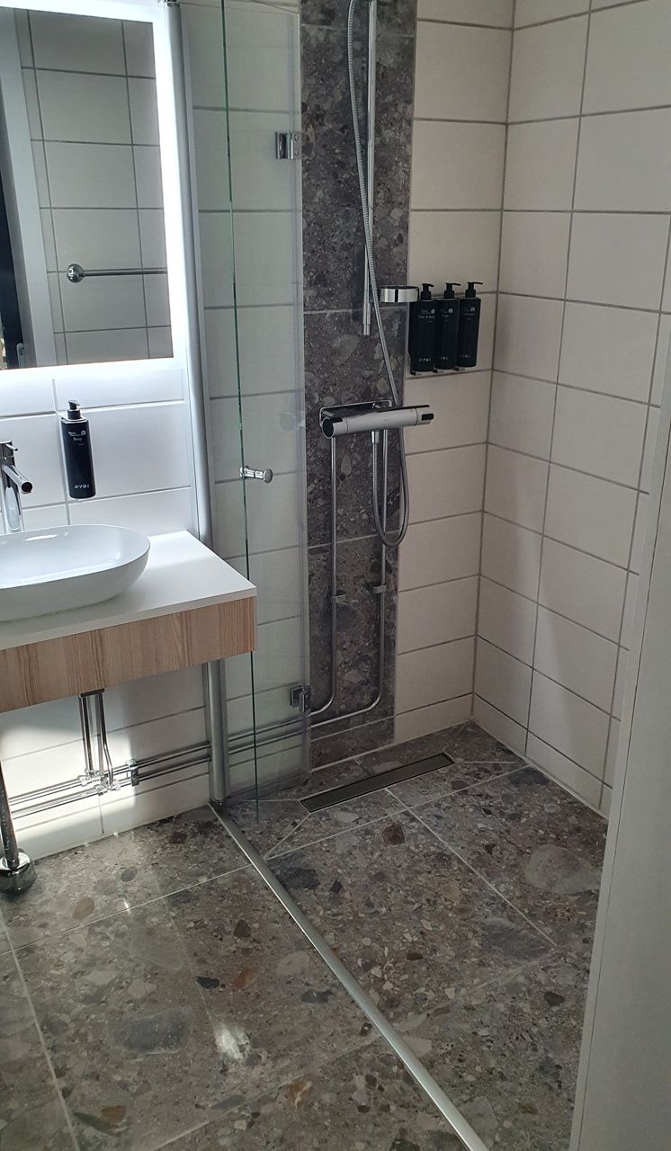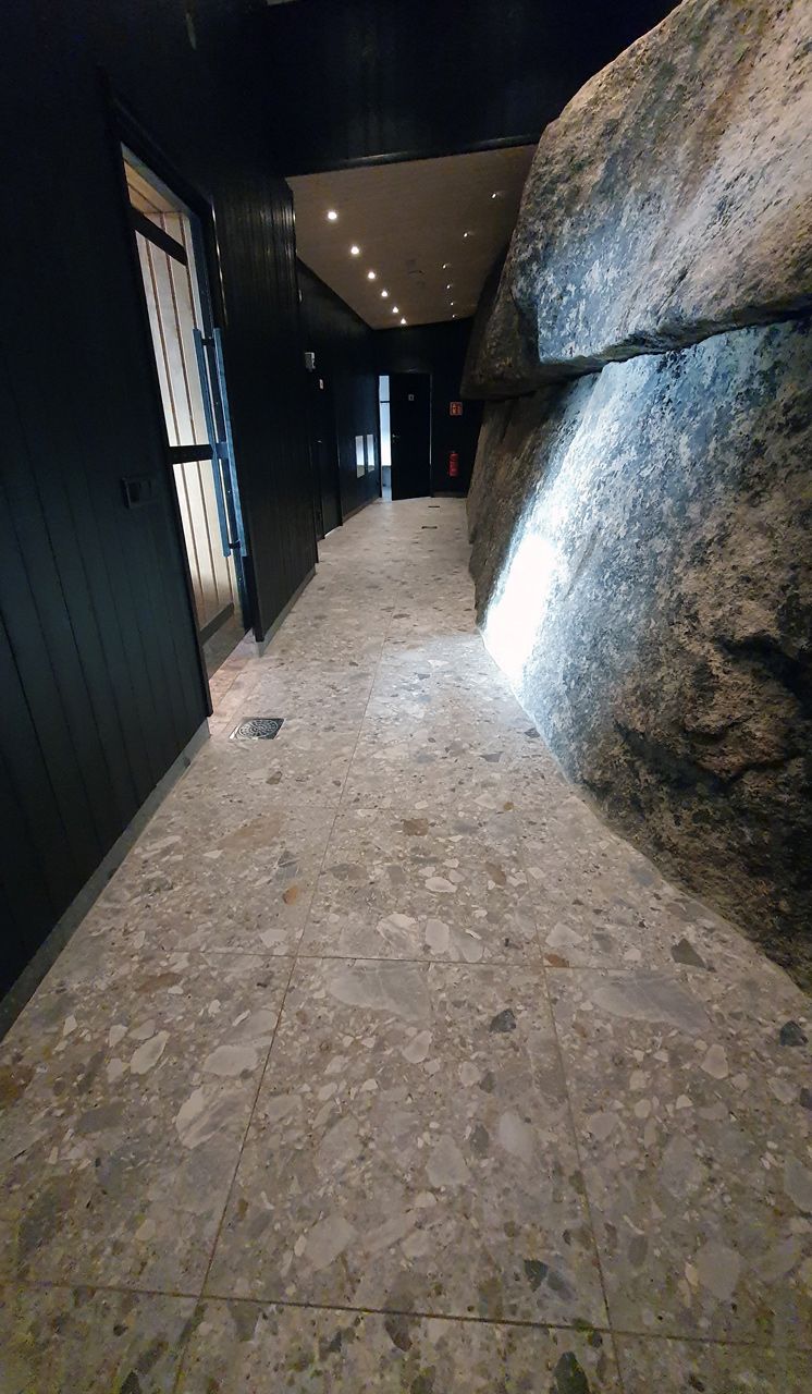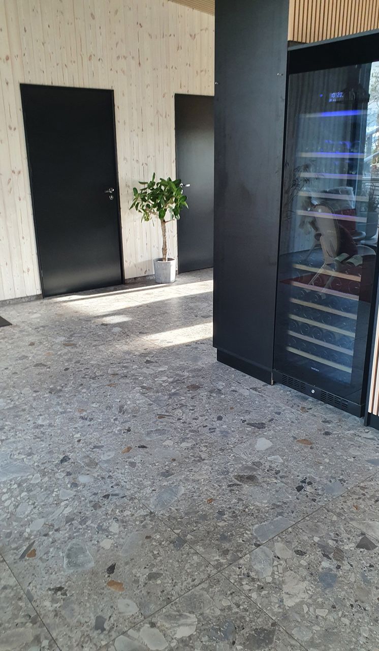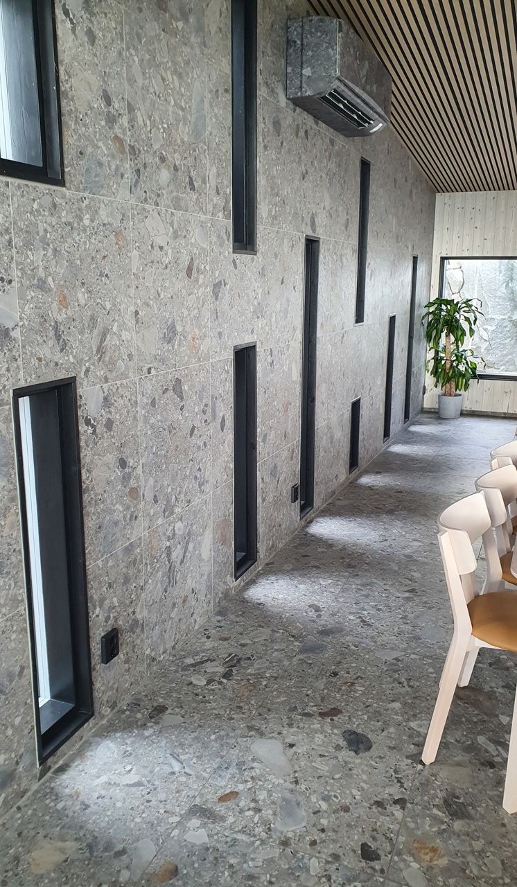 Material som valts till denna pärla är Norr Farge. Ett klockrent val då serien Norr för in den nordiska naturens element i det moderna hemmet/hotellet. Det naturliga uttrycket skapas av oregelbunden textur i lugna toner. Kulören Farge har lite större flagor med en djupblå nyans som avspeglar repad metall som möter det naturliga uttrycket i en perfekt matchning. En lager på lager effekt ger levande tredimensionell känsla.