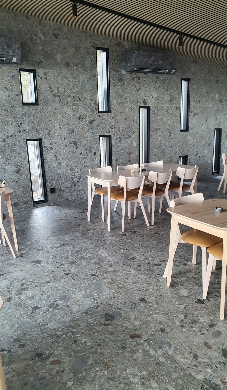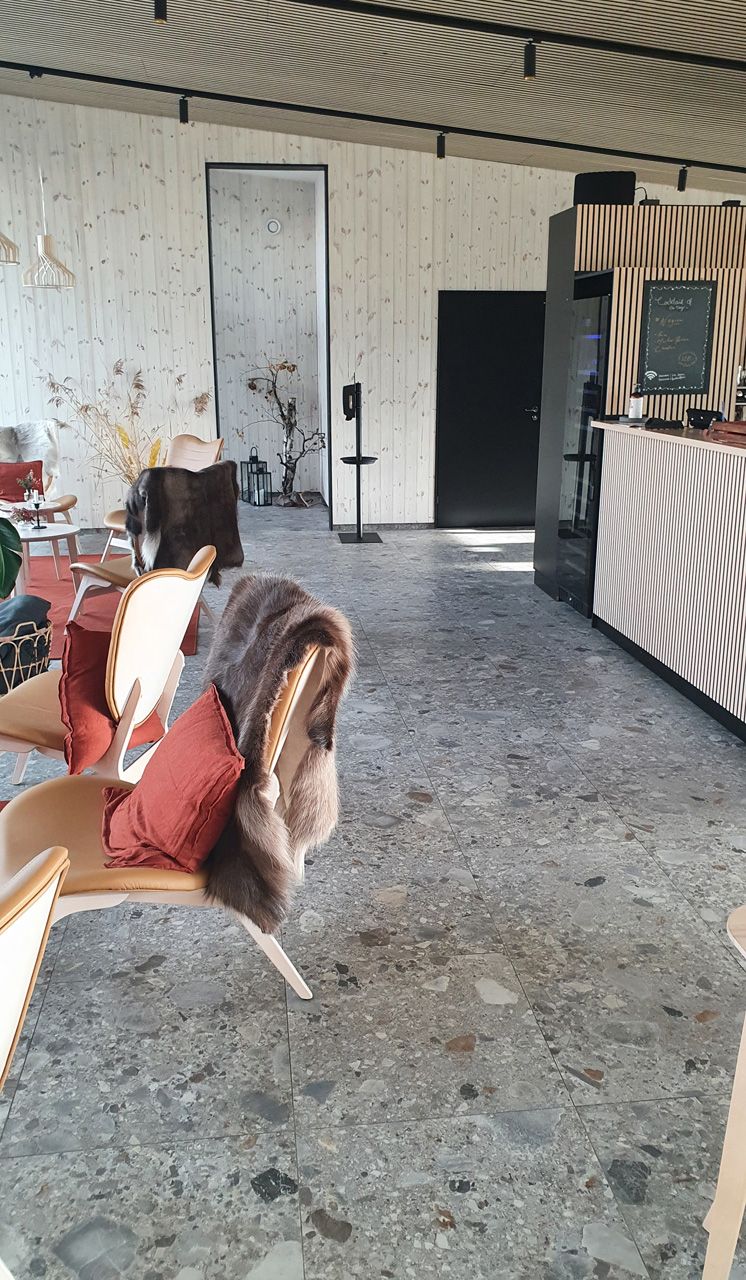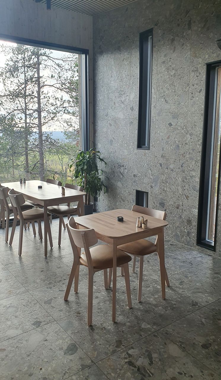 Riktigt vackert blir det i restaurangen där man valt att klä väggarna med Norr Farge som står sig i fonden av panoramautsikten.