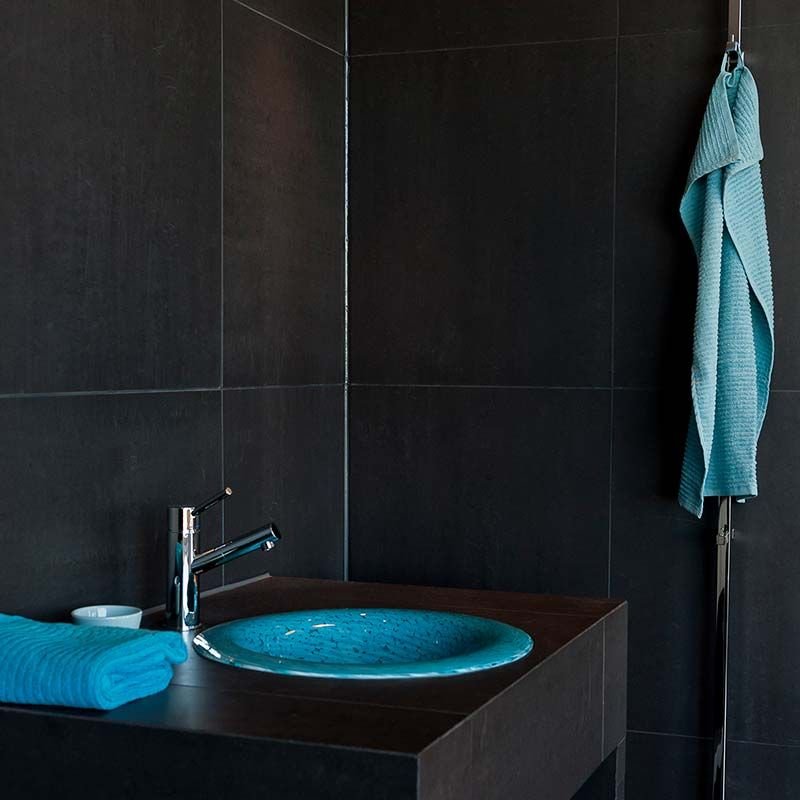 Med serien Gems kan du skapa ett riktigt mörkt badrum som med fördel kombineras med inredning i kontrasterande färger.