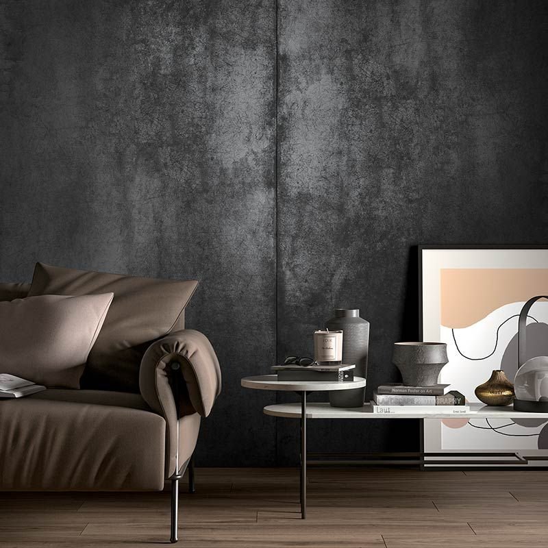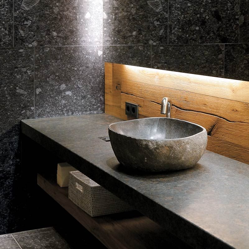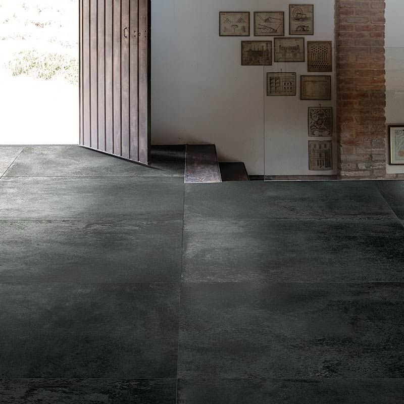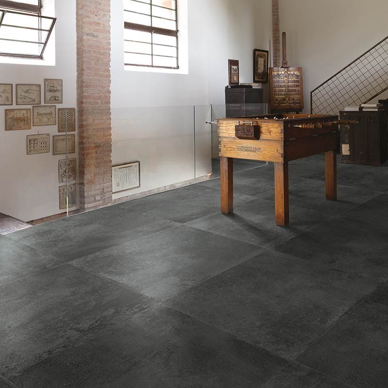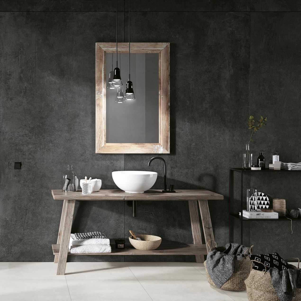 Glocal är rustik serie, inspirerad av betongens råhet och flexibilitet – här i stora big slabs i kulören Absolute 06.