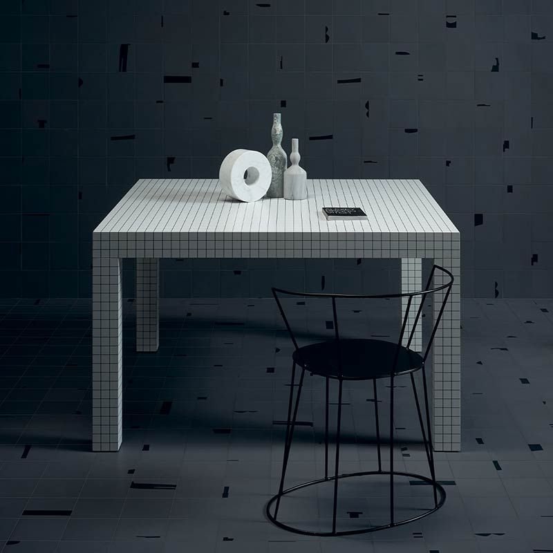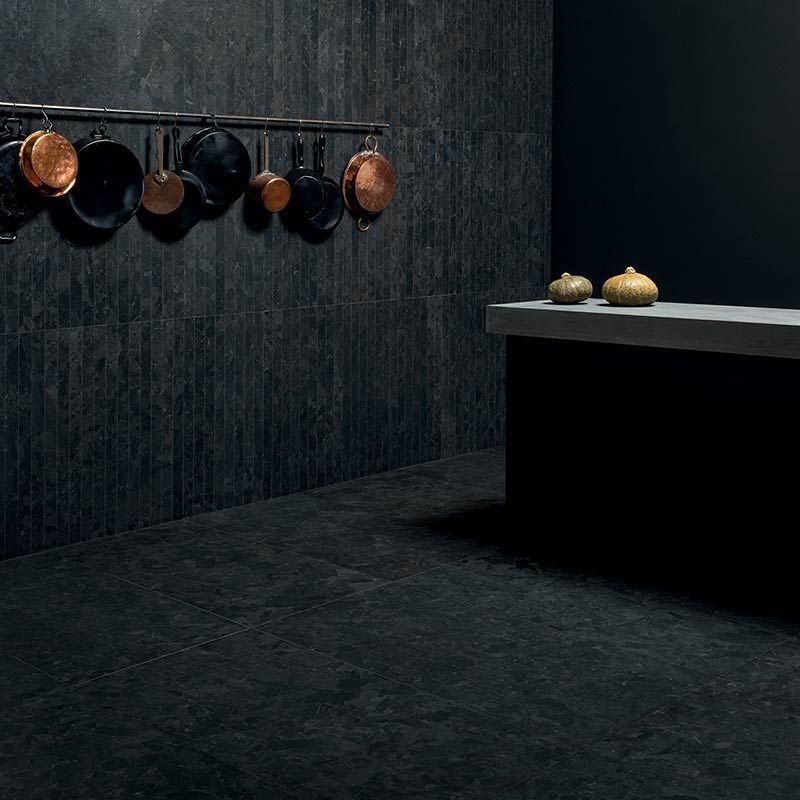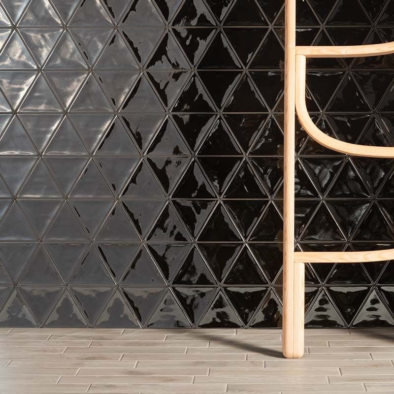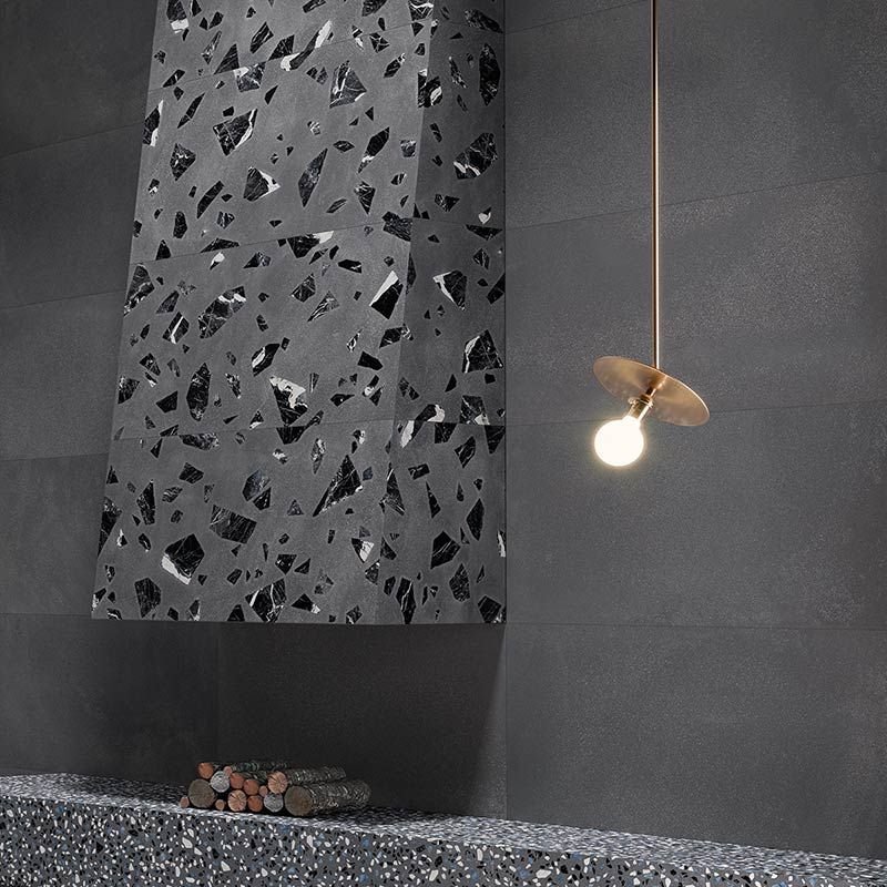 När du arbetar med svart i mindre utsträckning är det kul att ta ut svängarna i valet av plattornas form och utseende. Låt kaklet sticka ut, som med den triangelformade serien 3lati eller terazzoserien Medley från Ergon där stora bitar av marmor skapar unika ytor.