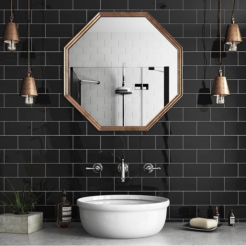 Blankt svart kakel i 7,5×15 skapar en klassisk look som passar utmärkt i badrummet.