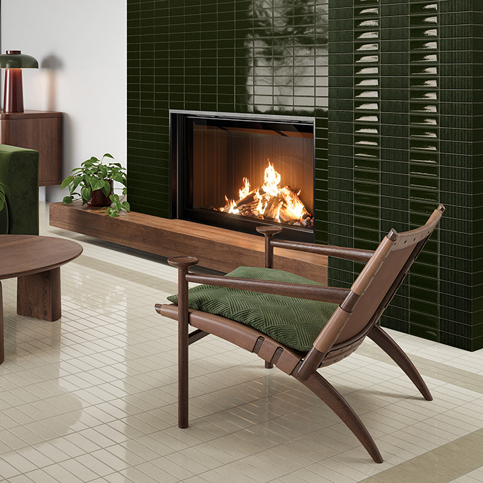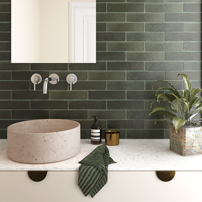 Buteljgrönt kakel i serien Argile från Equipe, satt i halvförband som förstärker plattornas skiftningar.