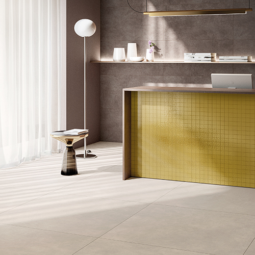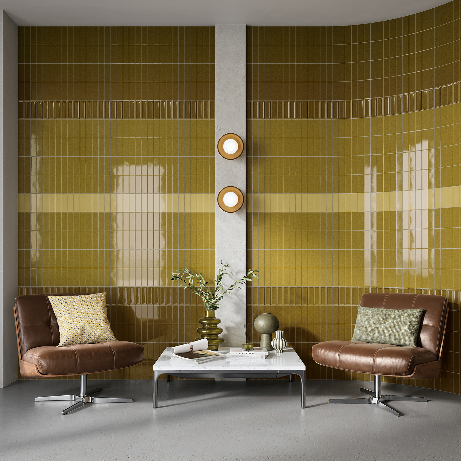 En reception med härlig mosaik i senapsgult ur serien Glocal bryter av ett minimalistiskt inrett väntrum.