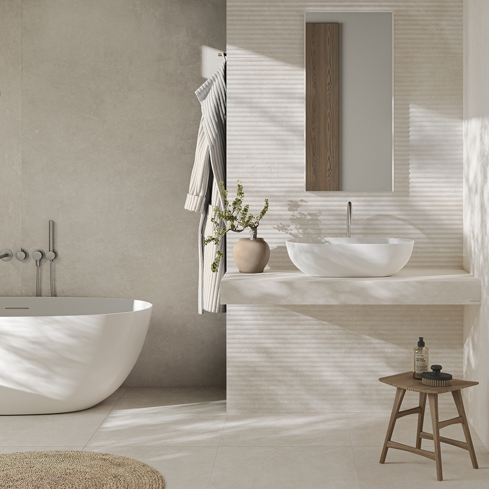 ReStone är inspirerad av kalksten och den klassiska Chauvigny-stenen från Vienne-regionen i södra Frankrike. Serien speglar kalkstenens unika struktur och tidlösa skönhet. Men det som verkligen gör ReStone unik är dess sammansättning: över 63% av materialet är återvunnet spill. Läs mer om ReStone här.