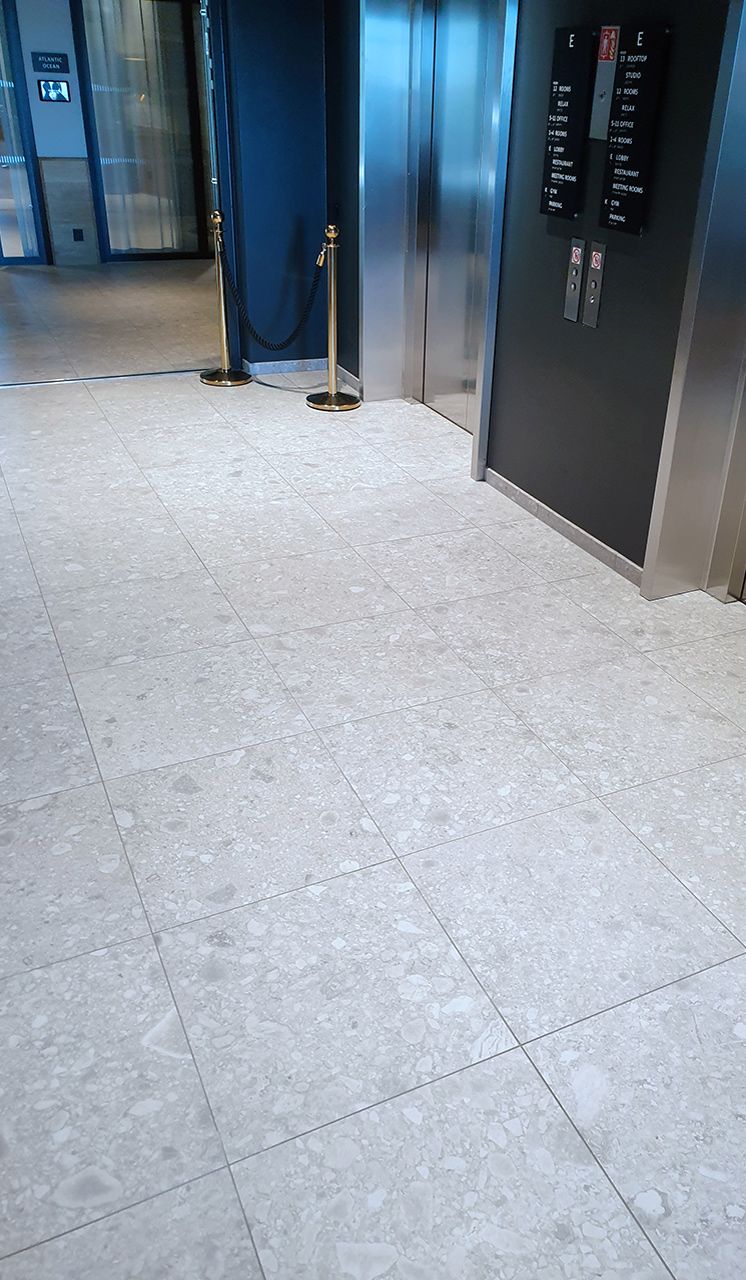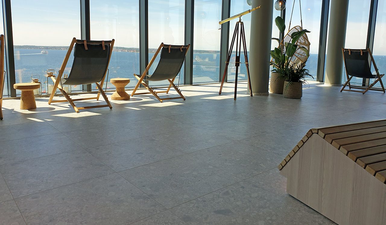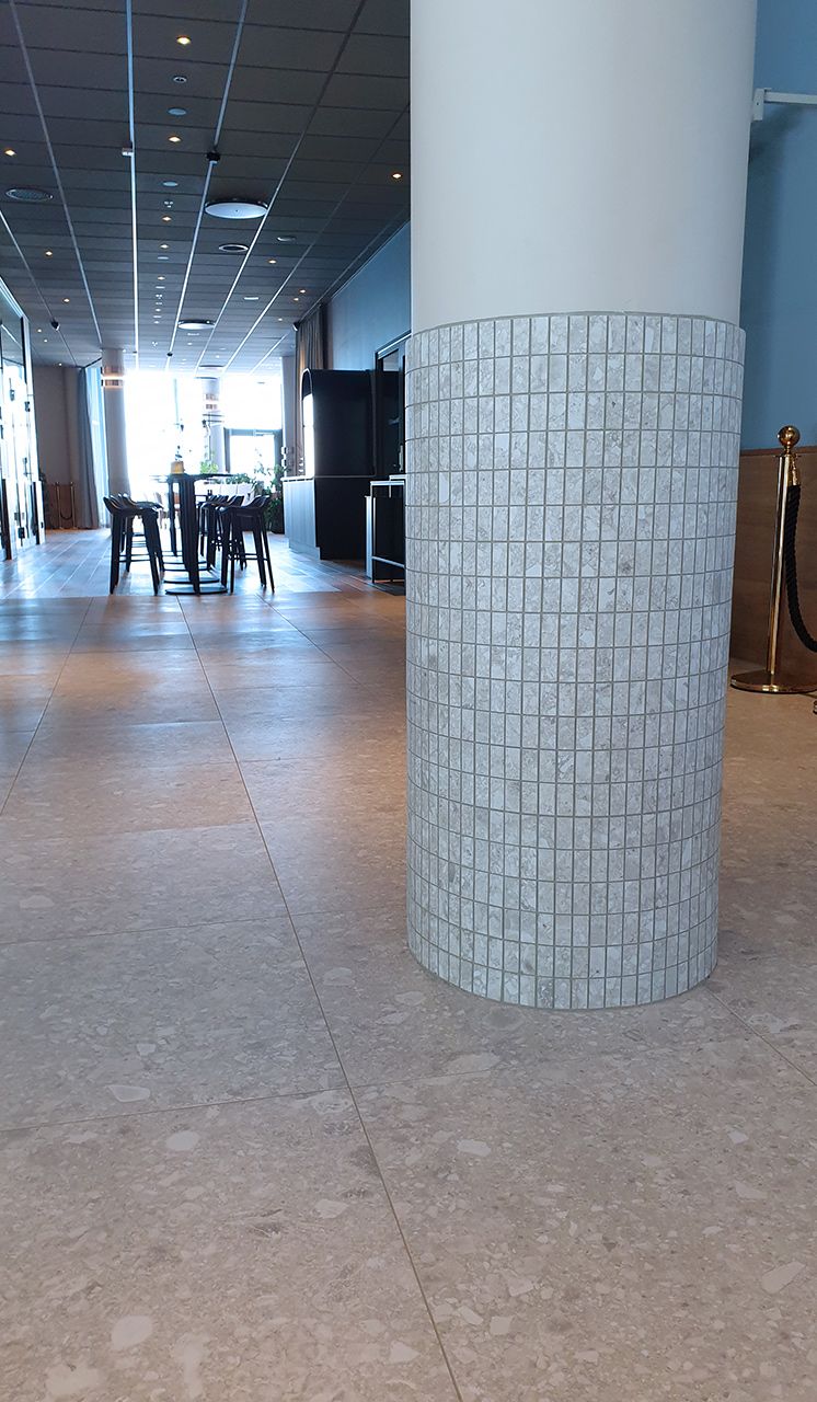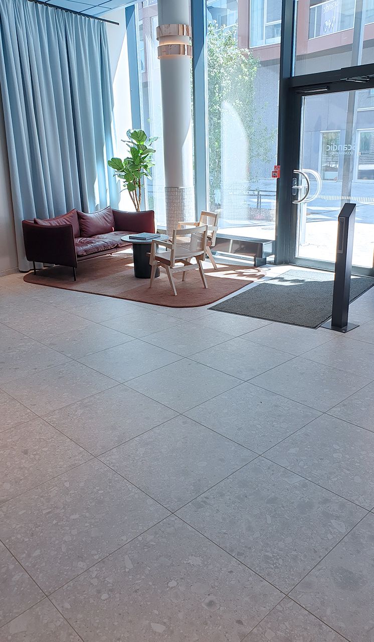 Koncept™, som är de som stått för inredningsdelen av hotellet, har valt att använda sig av Norr Vit 01 på stora delar av de allmänna ytorna. Lobby, hisshallar, relaxavdelning, allmänna toaletter, omklädningsrum och på pelare runt om i hotellet. Norr, med sin oregelbundna textur och sitt naturliga uttryck, för in den nordiska naturens element och skapar precis det rätta välkomnande intrycket.