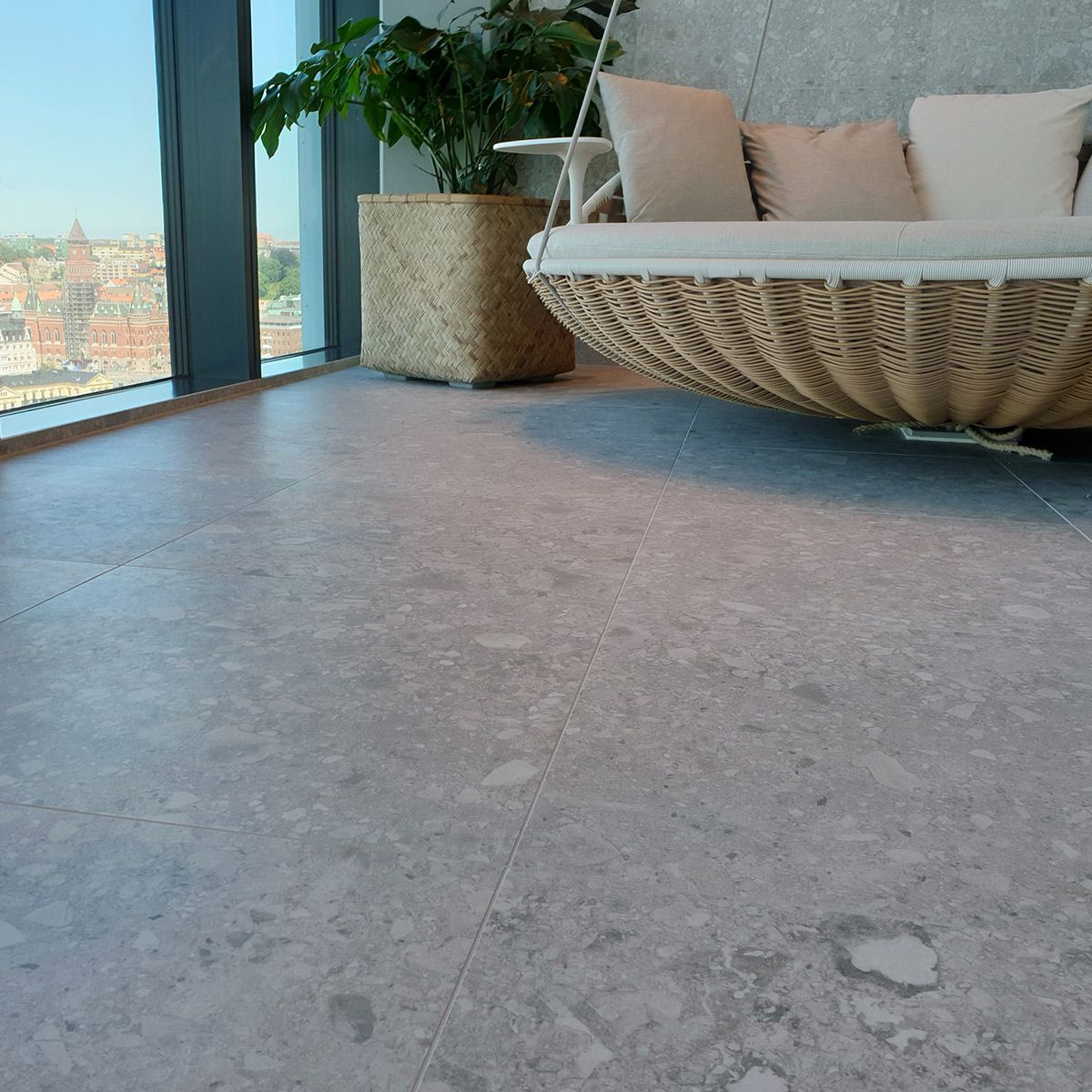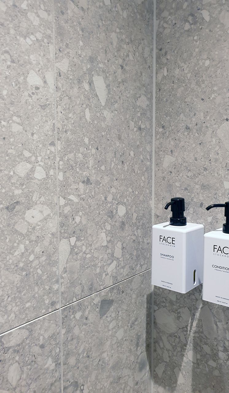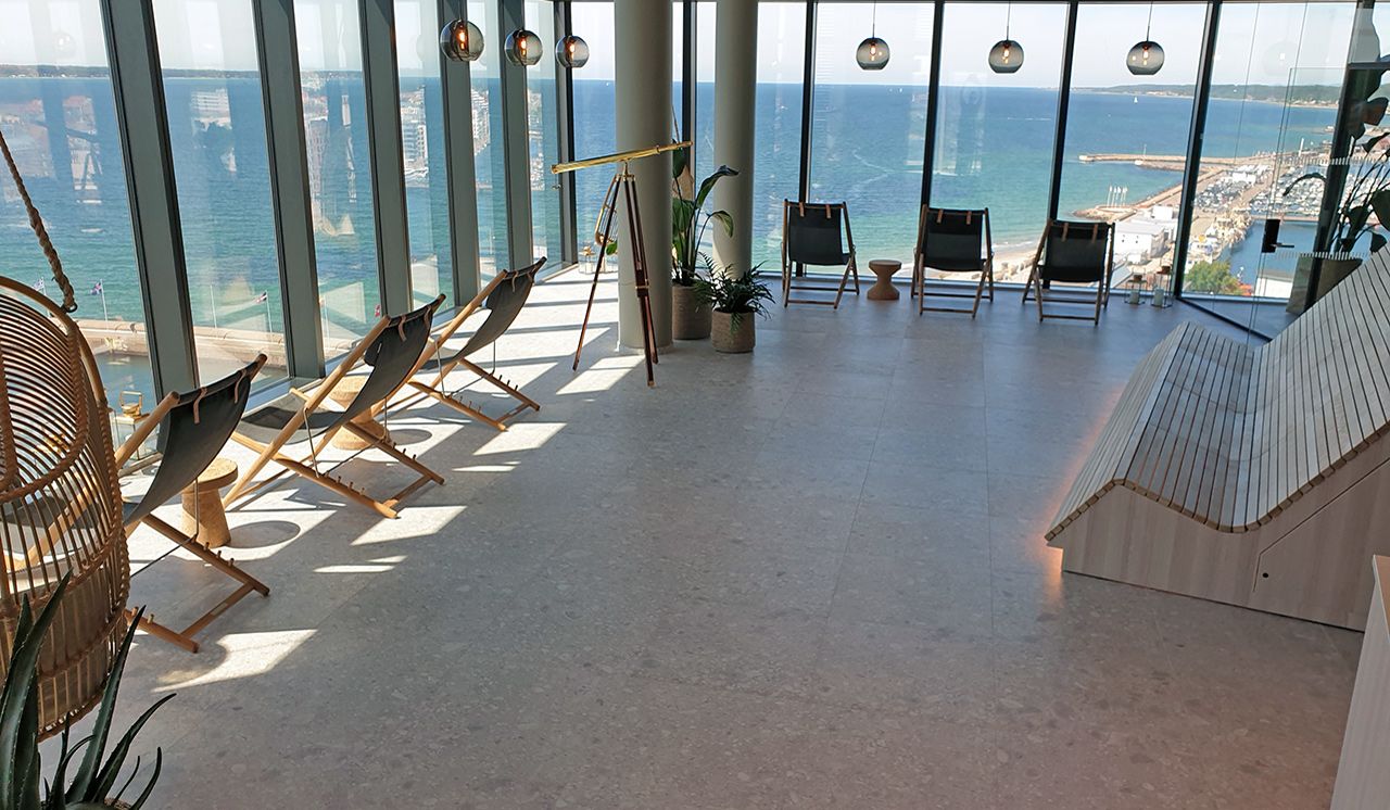 Koncept™, som är de som stått för inredningsdelen av hotellet, har valt att använda sig av Norr Vit 01 på stora delar av de allmänna ytorna. Lobby, hisshallar, relaxavdelning, allmänna toaletter, omklädningsrum och på pelare runt om i hotellet. Norr, med sin oregelbundna textur och sitt naturliga uttryck, för in den nordiska naturens element och skapar precis det rätta välkomnande intrycket.