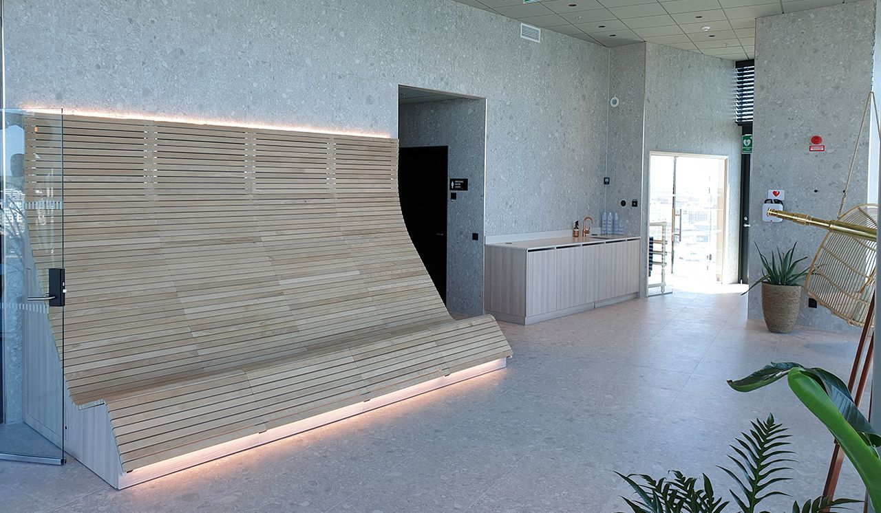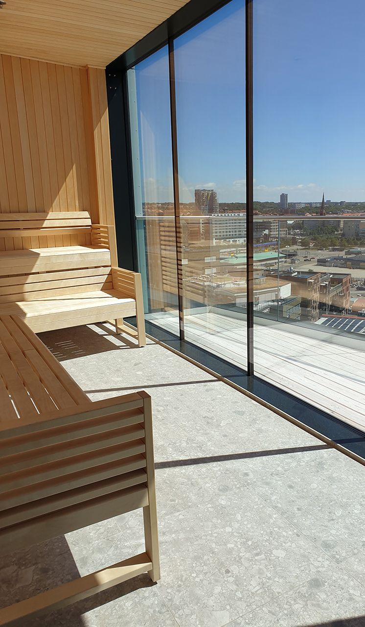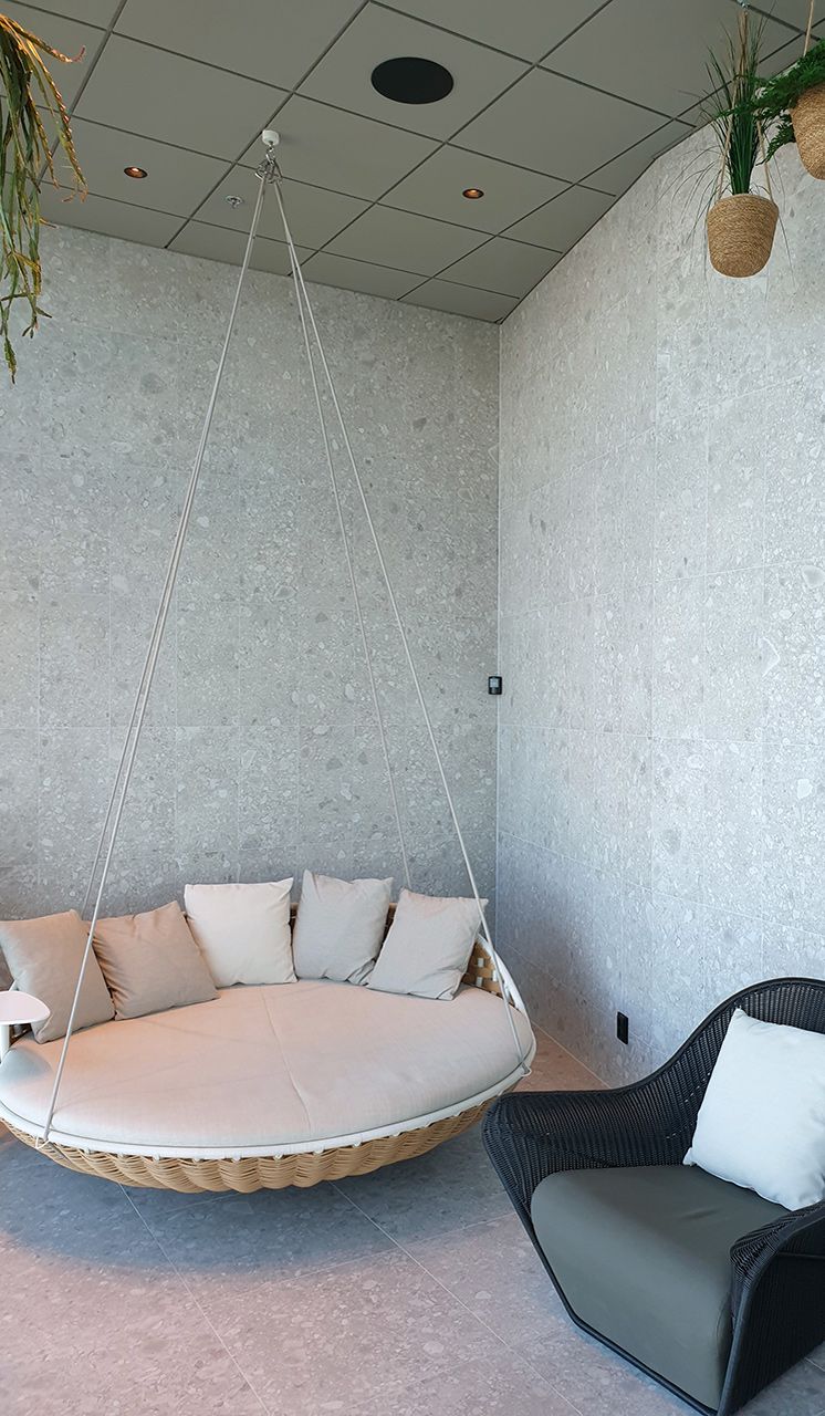 På våning 12 finns hotellets relaxavdelning, här kan man slå sig ner bland gröna växter i de hängande fåtöljerna och njuta av den hänförande panoramautsikten eller varför inte insupa känslan av Norr som pryder både väggar & golv.