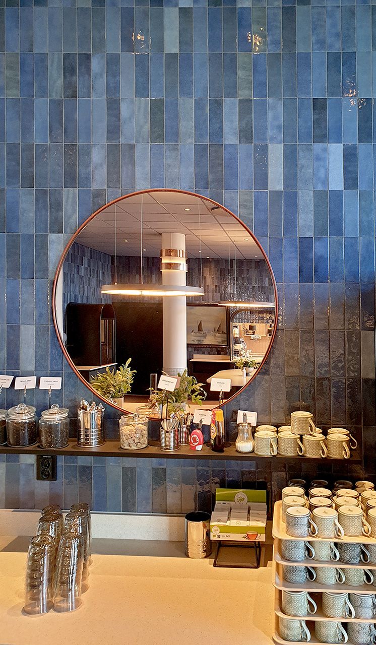 På väggar i restaurang och frukostdel återfinns Artisan vars rustika look samt läckra blänk speglar och sprider ljuset i rummet. Man valde Colonial Blu, en kulör som gifter sig väl med omgivningarna.