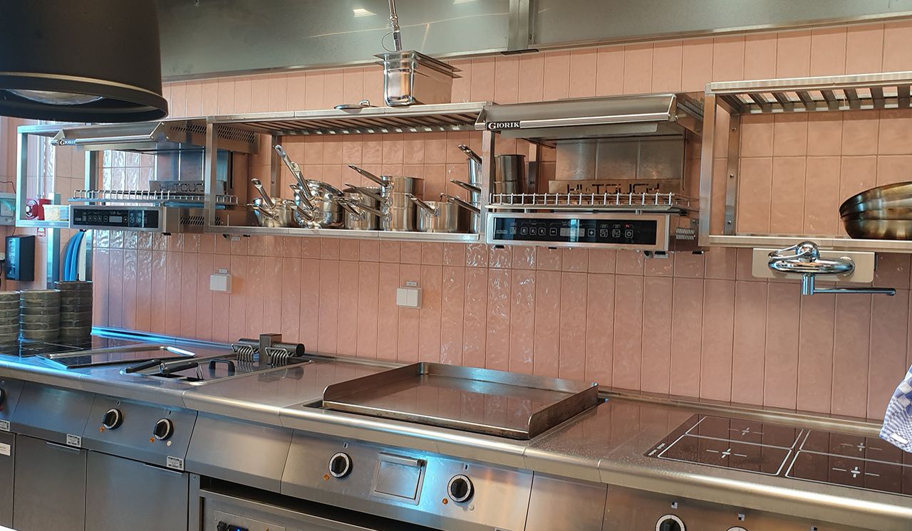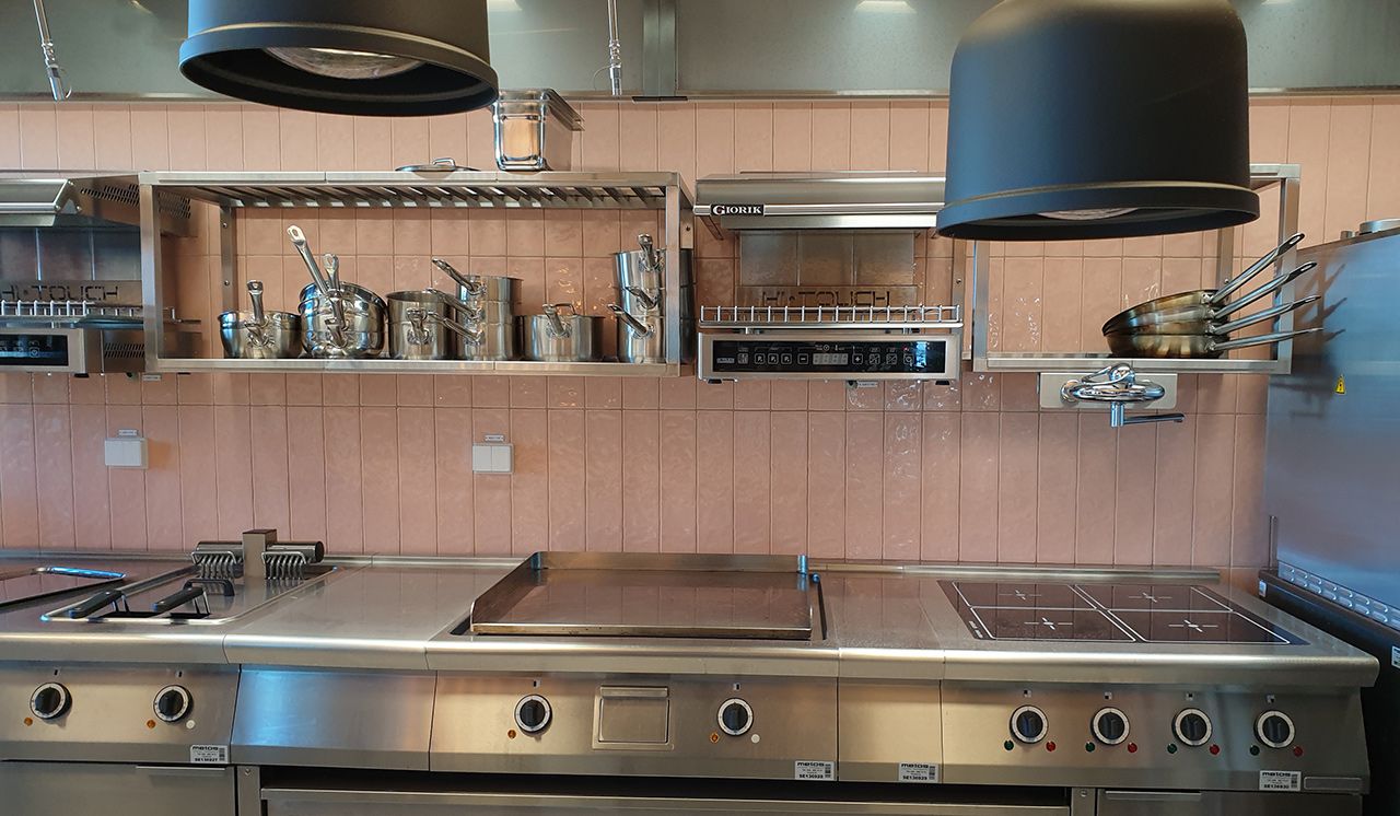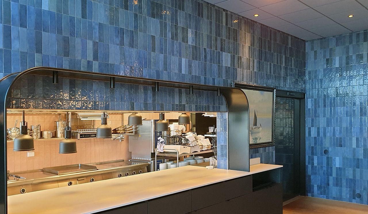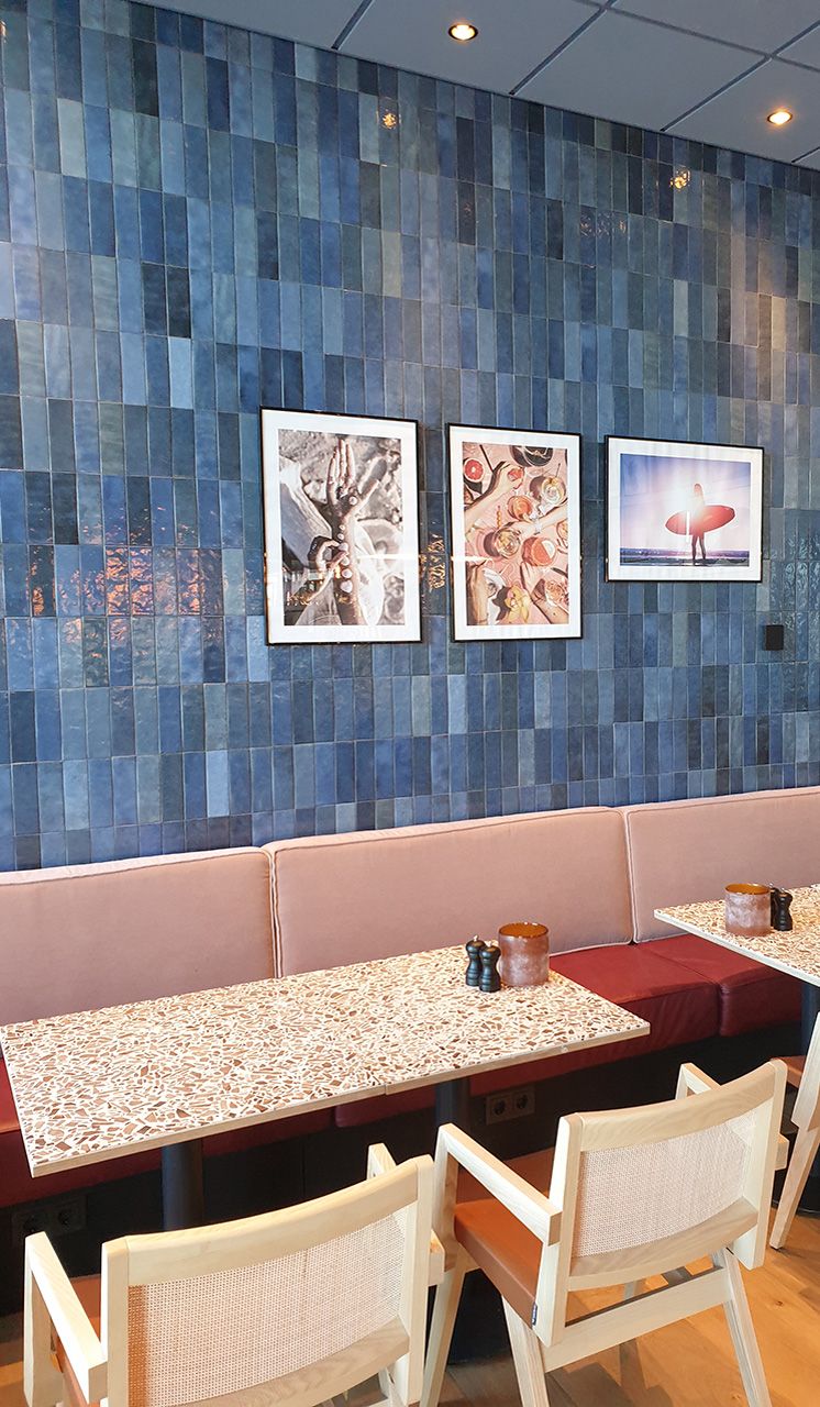 I det angränsande storköket, som man skymtar genom serveringsöppningen, föll valet på Old School Evoke i kulören Pink. En serie som flörtar med det konstnärliga uttrycket i keramik från länderna runt Medelhavet där kakeltraditionen sträcker sig tusentals år tillbaka i tiden.