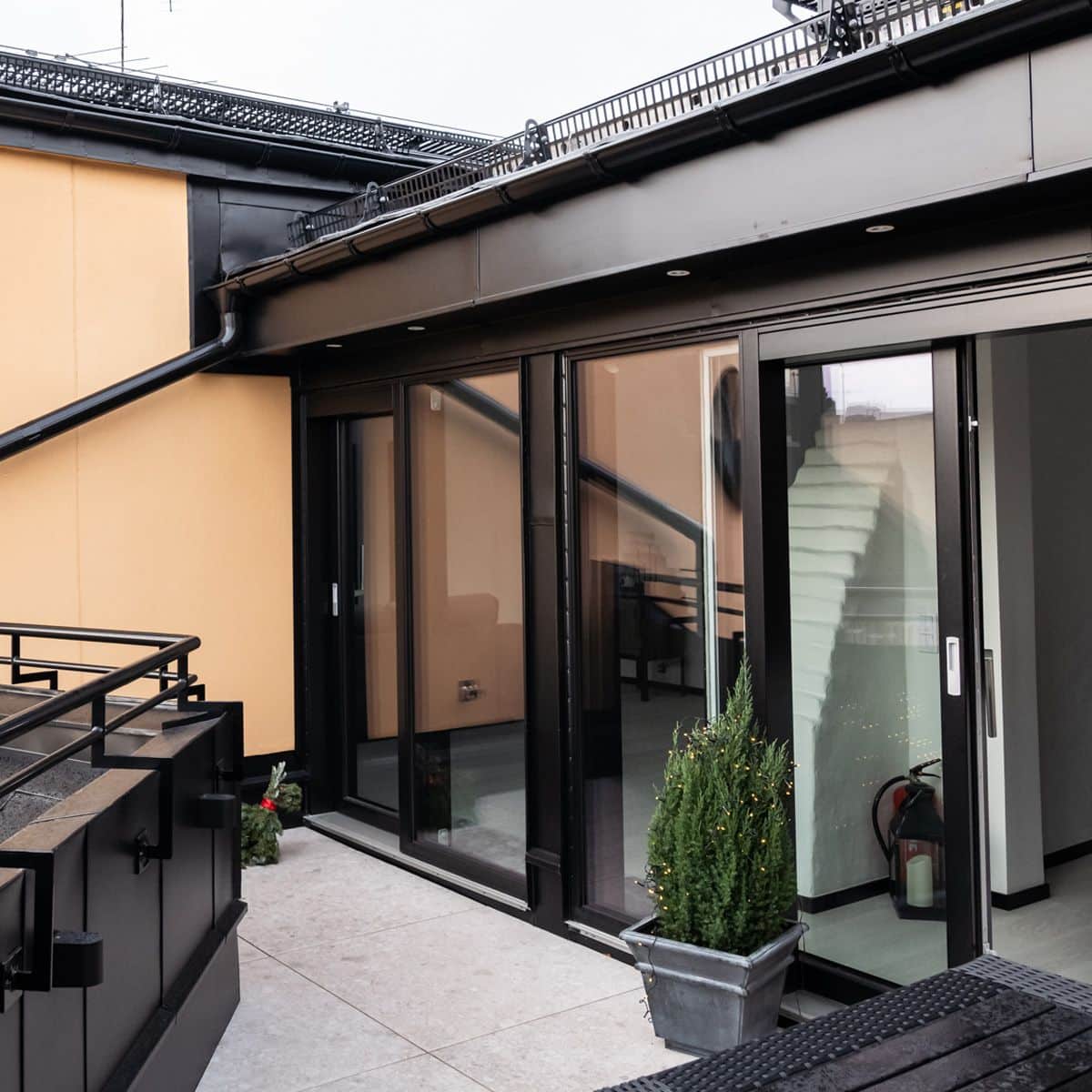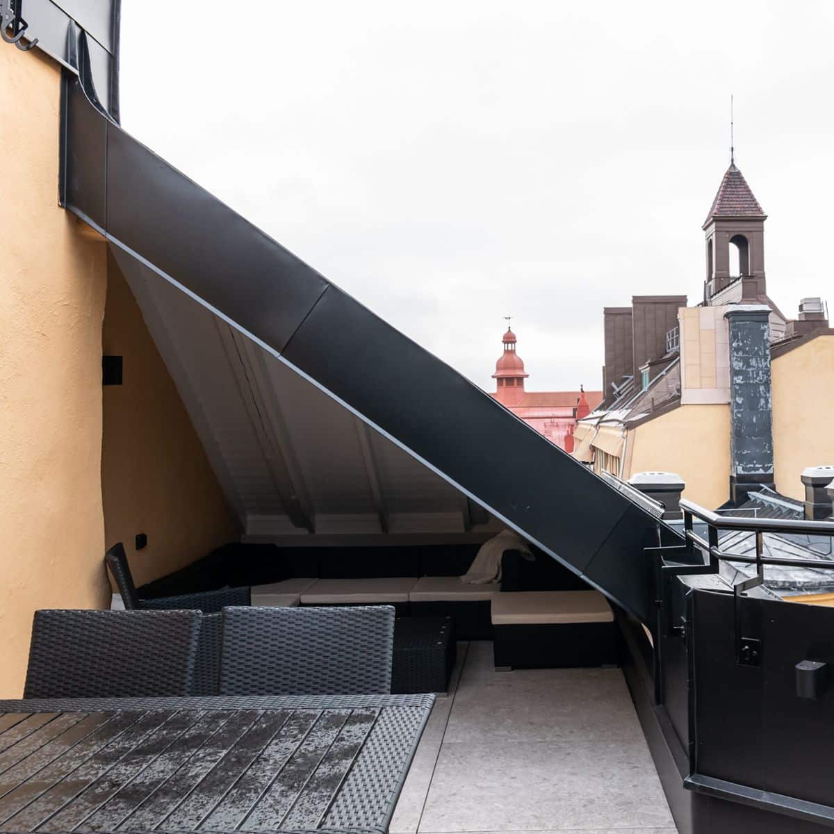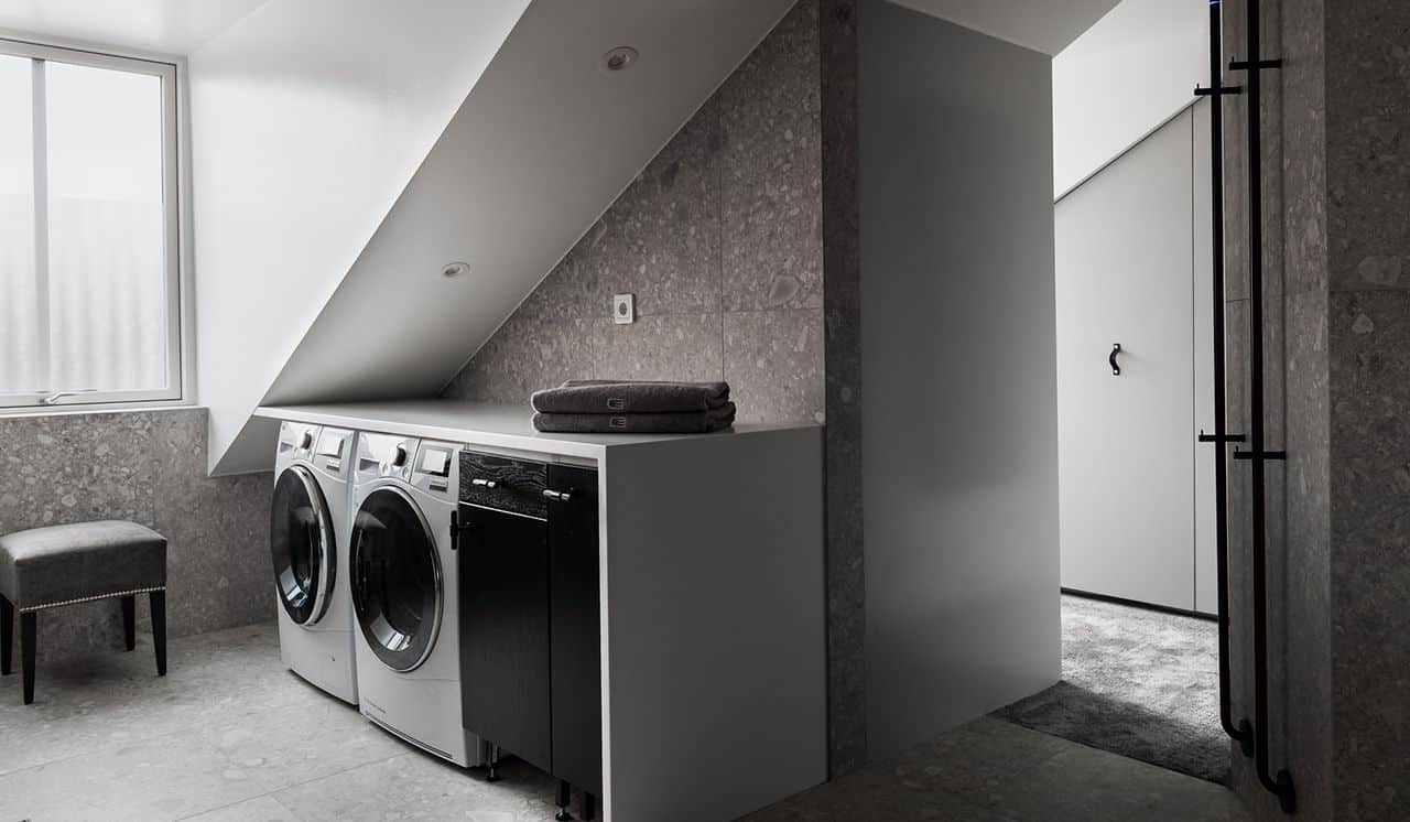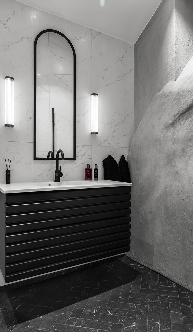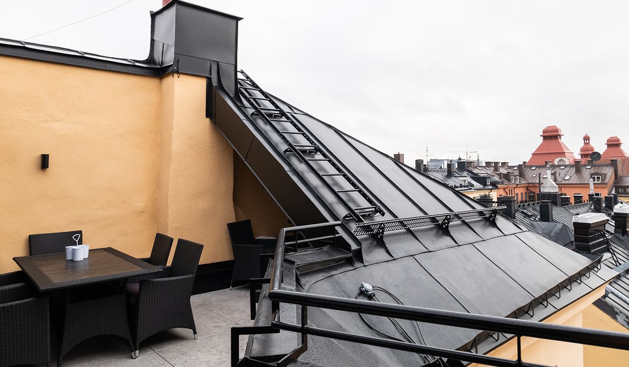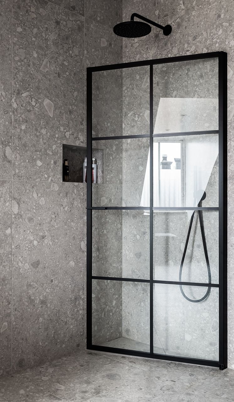 I stora badrummet med tillhörande tvättdel pryder Norr Vit verkligen sin plats. Och i det mindre badrummet har man lagt Roma Grafite i ett läckert fiskbensmönster på golvet samt vackra Carrara på väggarna. Även på takterrassen har man använt sig av Norr Vit.