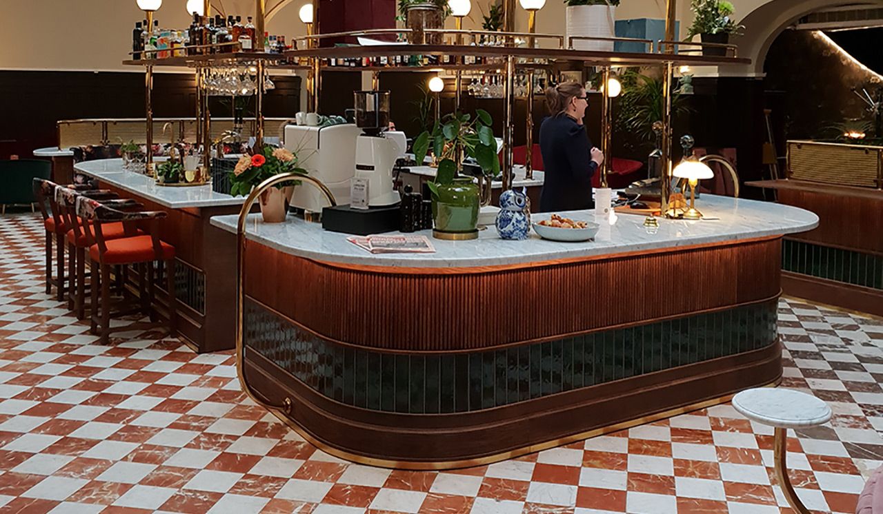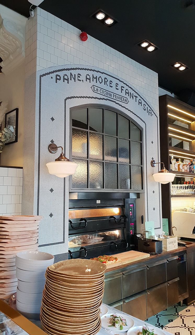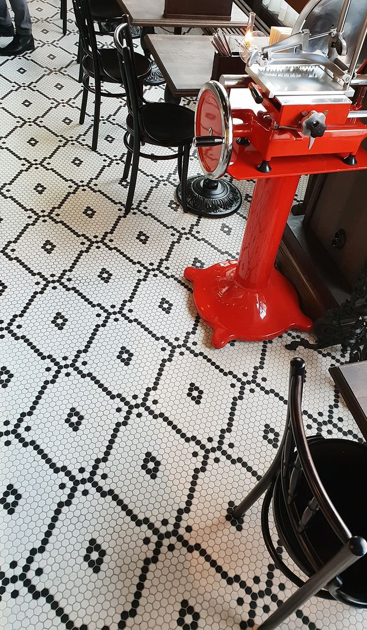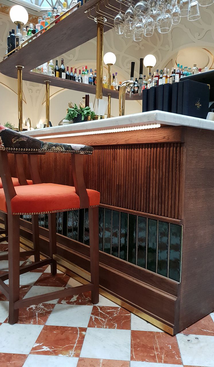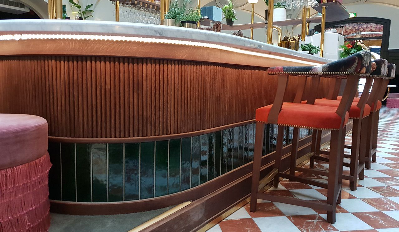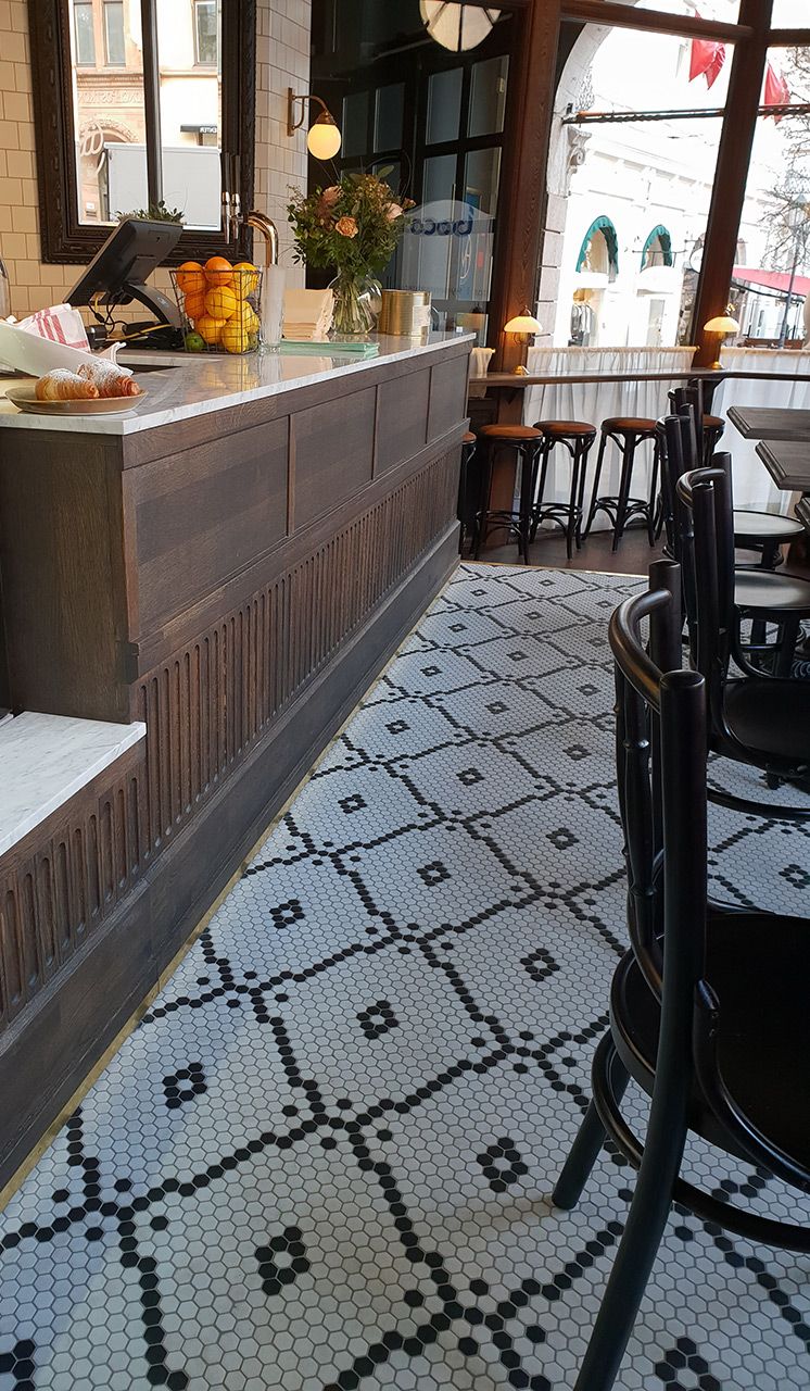På bardisken i Atrium baren, med sin slående arkitektur och inbjudande design, återfinns en grön handgjord kakel från italienska Pecchioli. Vidare i Venti trattoria, det rebelliska vincaféet, hittar ni en specialbeställd vit och svart mosaik i mönster med tillhörande text från STON.