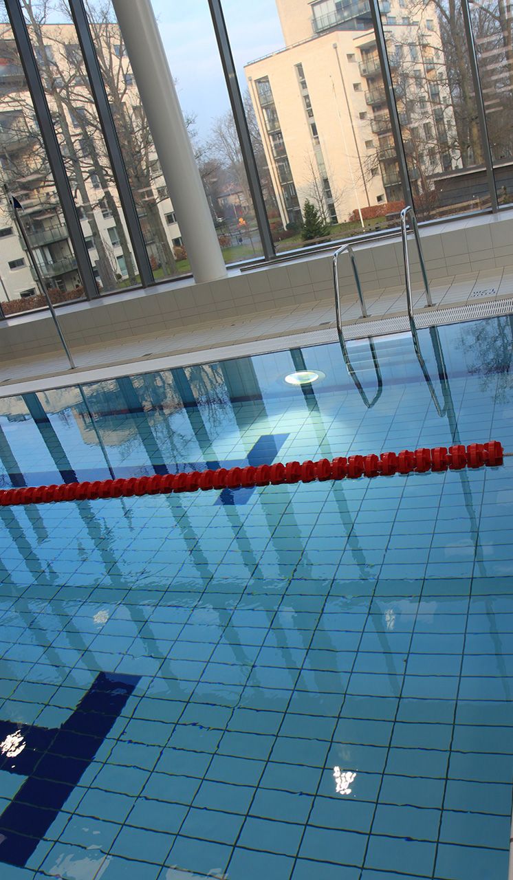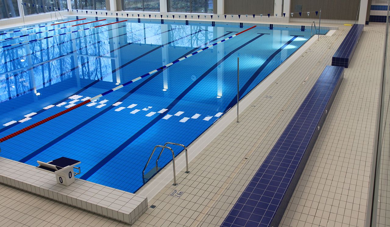 Motionsbadet med sin 25-metersbassäng, 10 banor, både torr & blöt läktare samt ett 5-meters hopptorn är byggd med en härlig rymd. De stora panoramafönsterna ut mot staden ger ett fantastiskt ljusinsläpp. Therese Alshammar som invigningssimmade 25 meter i det nya badhuset sa ’ Det är en fantastisk fin anläggning. Kanske en av de bästa jag sett’, när hon klev upp ur bassängen efter premiärsimningen.