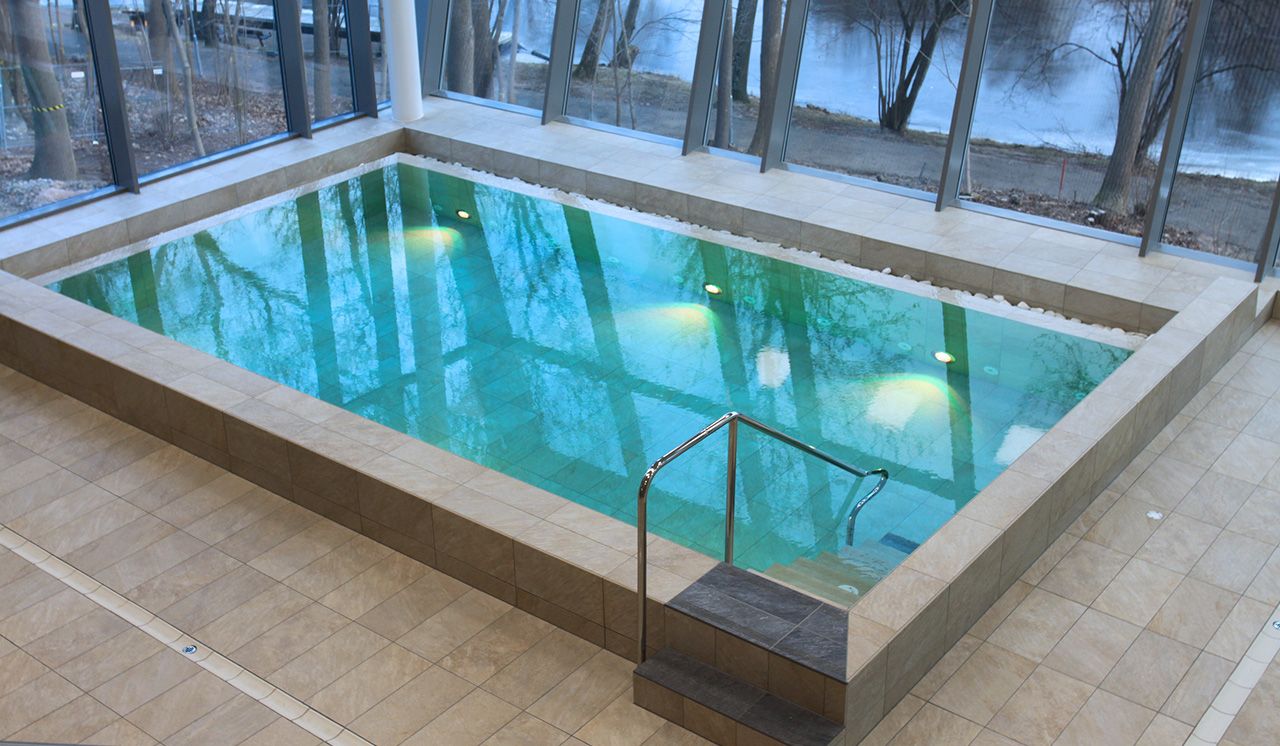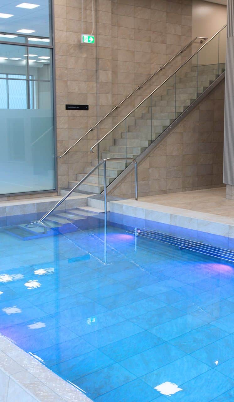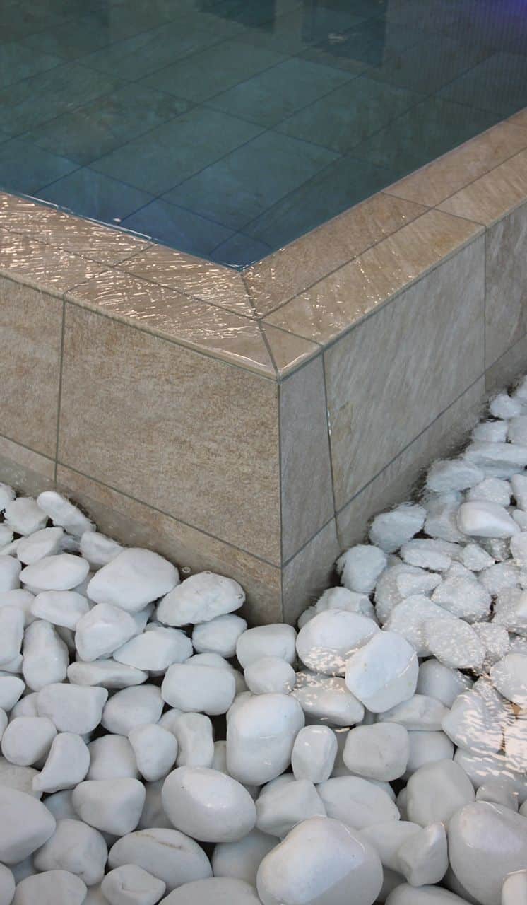 Till Infintiypoolen, bastu och duschdel valdes serie Quarziti. Serien tar sin inspiration från naturen och dess struktur skapar skuggningar som ger ytan ett föränderligt utseende. En passande platta till denna pool som visuellt övergår i Rönne å när vattnet rinner över kanten.
