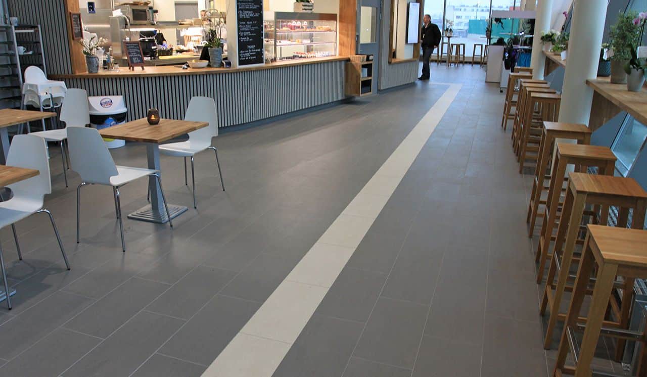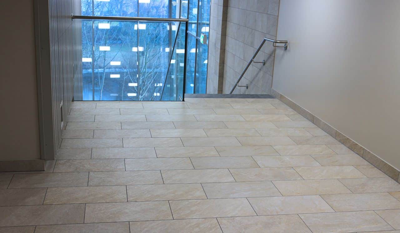 Till entré, bistro, korridorer samt gångstråk till bl.a. gymdelen har man använt serie Gems. Gems är en traditionell, slitstark och mycket populär granitkeramik.