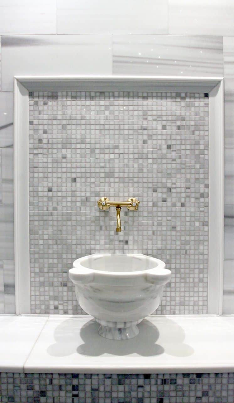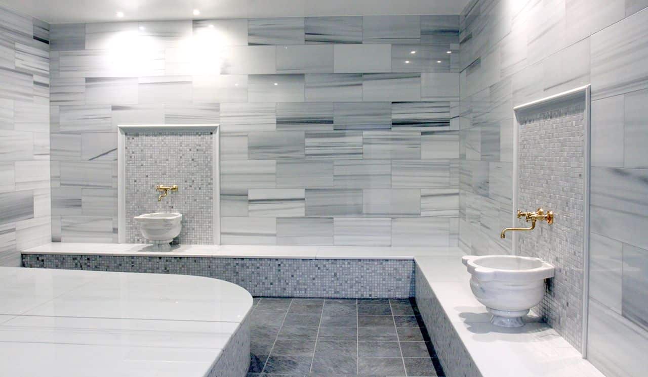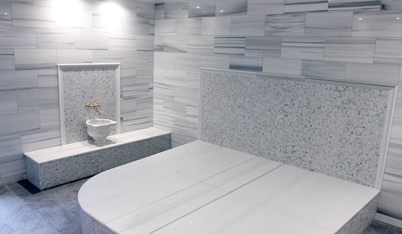 I den vackra hamam delen har arkitekten valt att använda sig av marmor genomgående förutom på golvet.