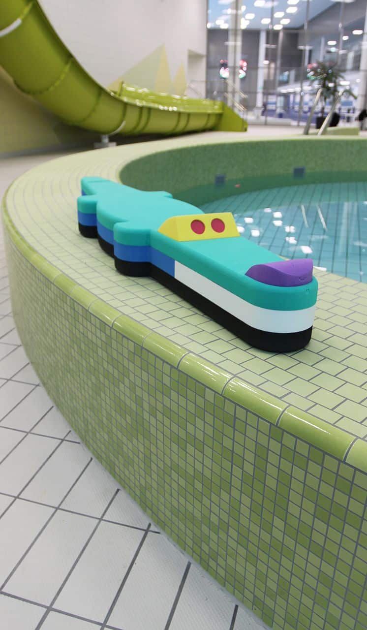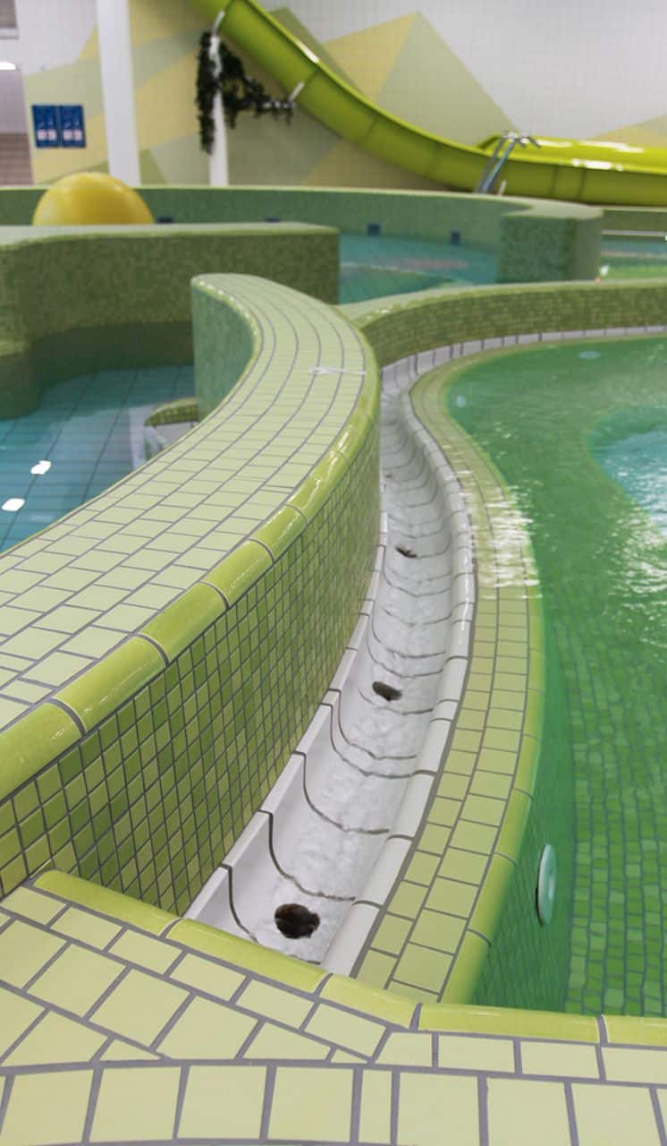 I äventyrsdelen med bland annat en vågbolls- och strömvirvelsbassäng har arkitekterna valt ett mosaikmönster i olika gröna nyanser. Formerna är mjuka och organiska, mosaiken är satt med precision i slingriga linjer och svängda ytor. Rundande kakelkanterna finns överallt då barn har en tendens att rulla upp över kanterna när de går i och ur badet. På ena långsidan finns de båda vattenrutschkanorna, även dessa i grönt. Väggen vid rutschkanan är tänkt att inspirera besökarna till att befinna sig på en strand.