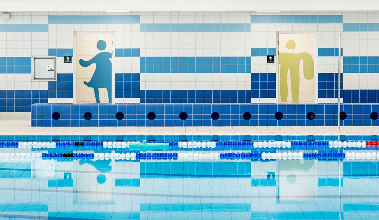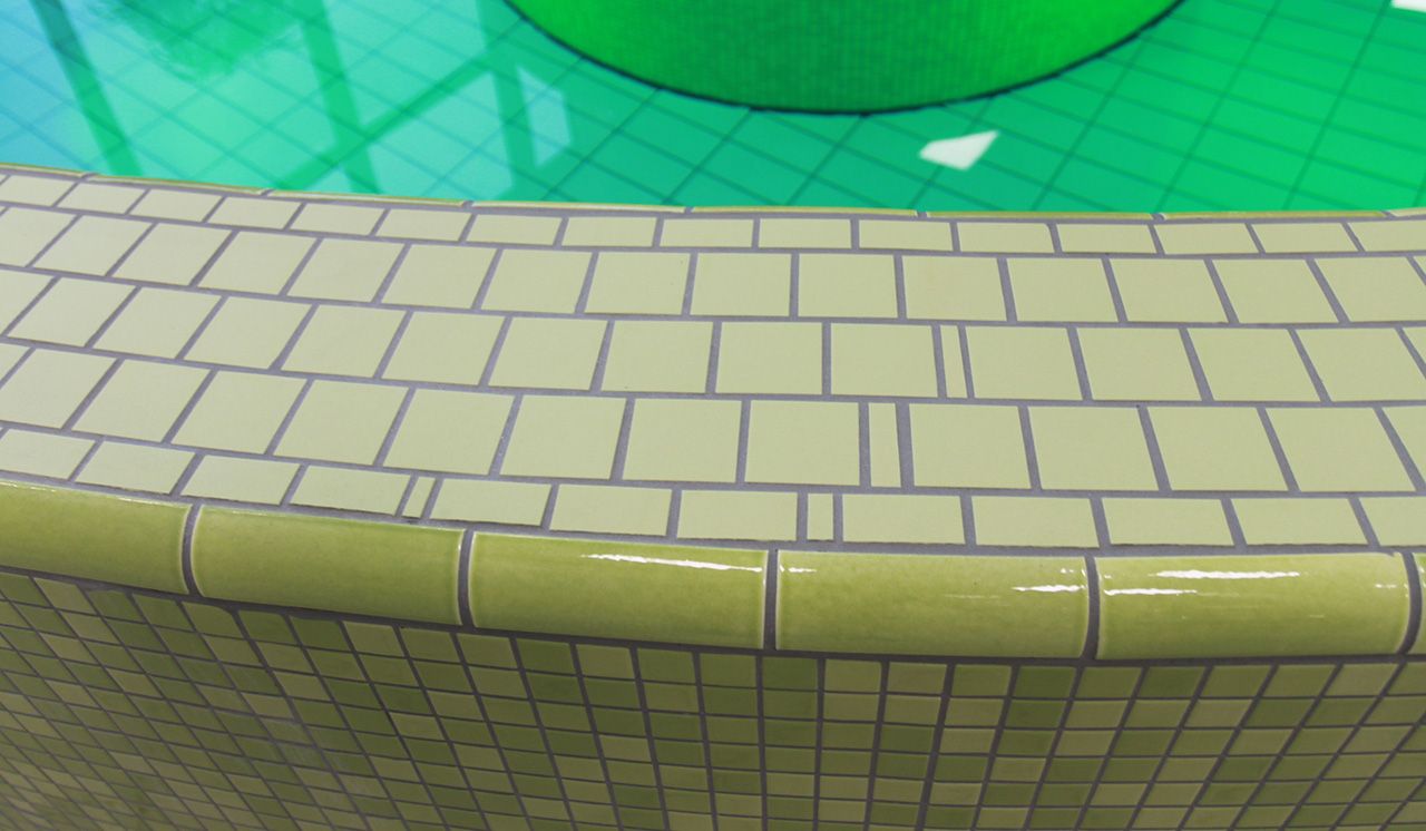 Material som använts till dessa poolområden och omklädningsrummen kommer från CE.SI. samt Buchtal.