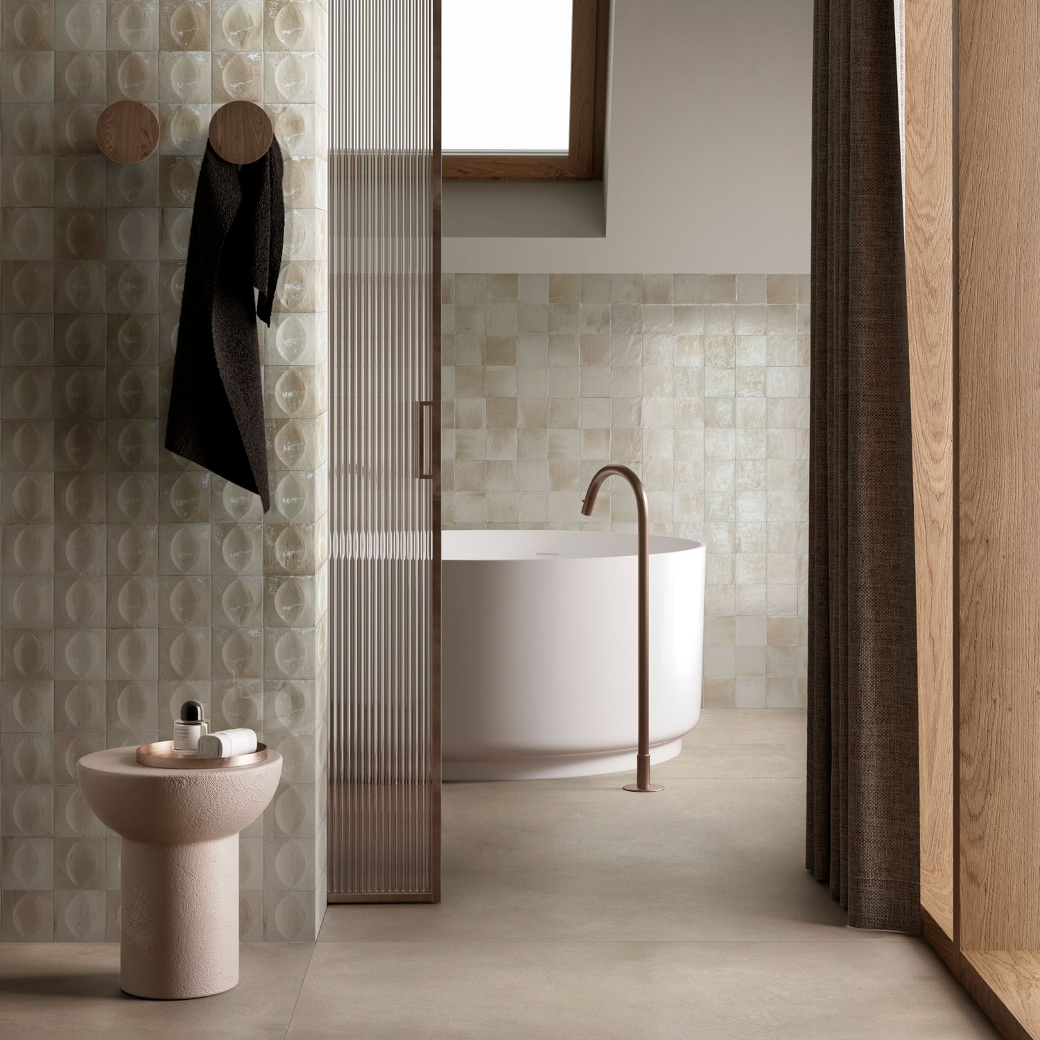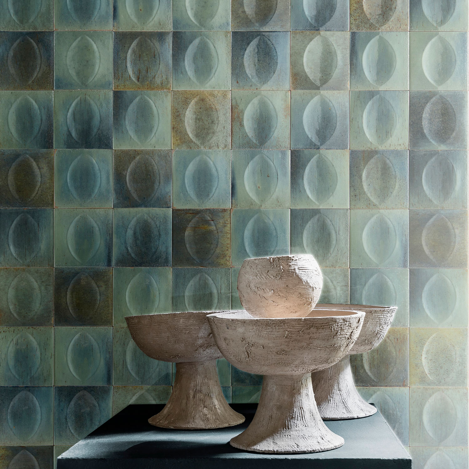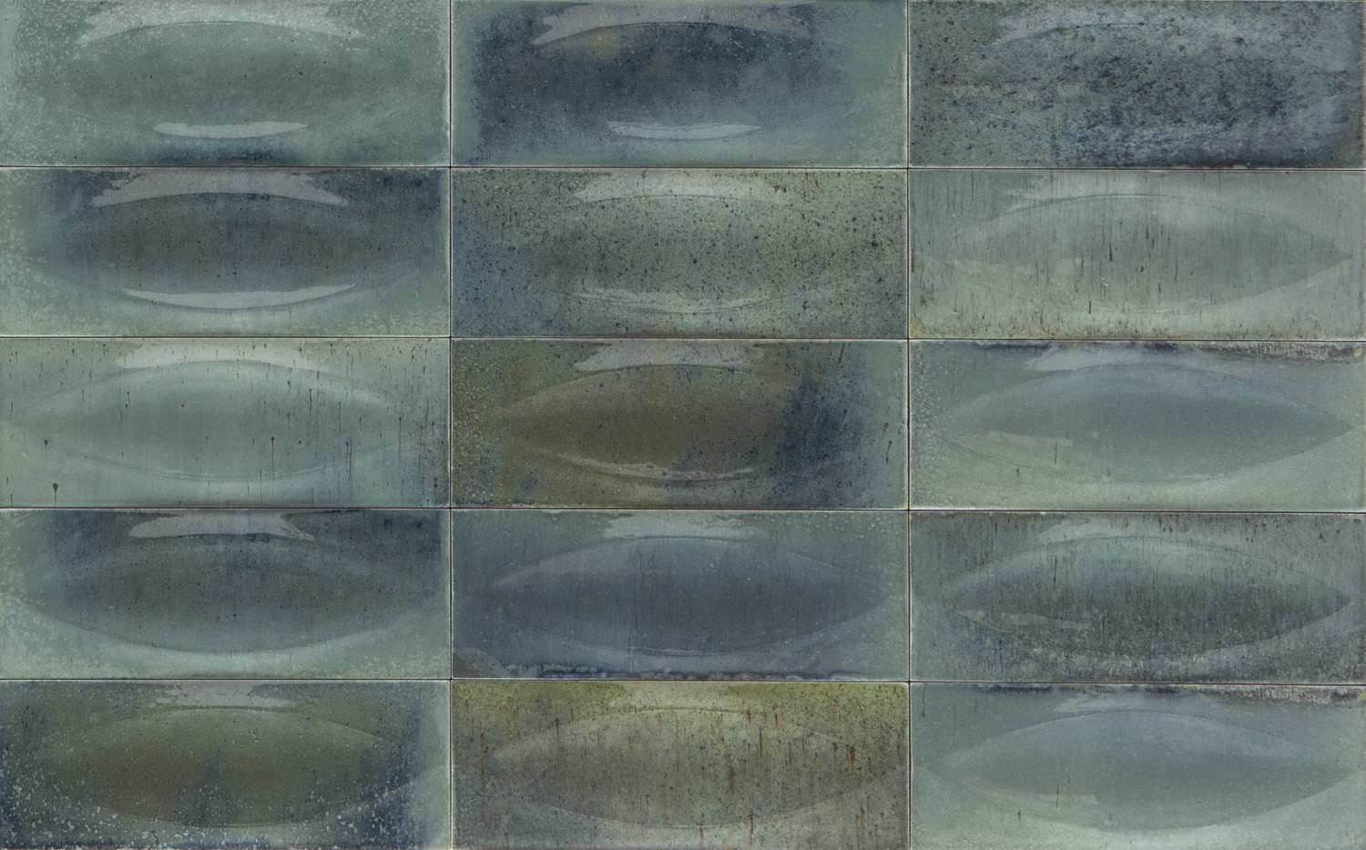 Superglansiga konkava och konvexa ytor i kombination med tredimensionella strukturer växlar på väggarna och ger dem liv. En palett av färger och storlekar. Plattorna är modulbaserade och med raka kanter för många sättningsalternativ.