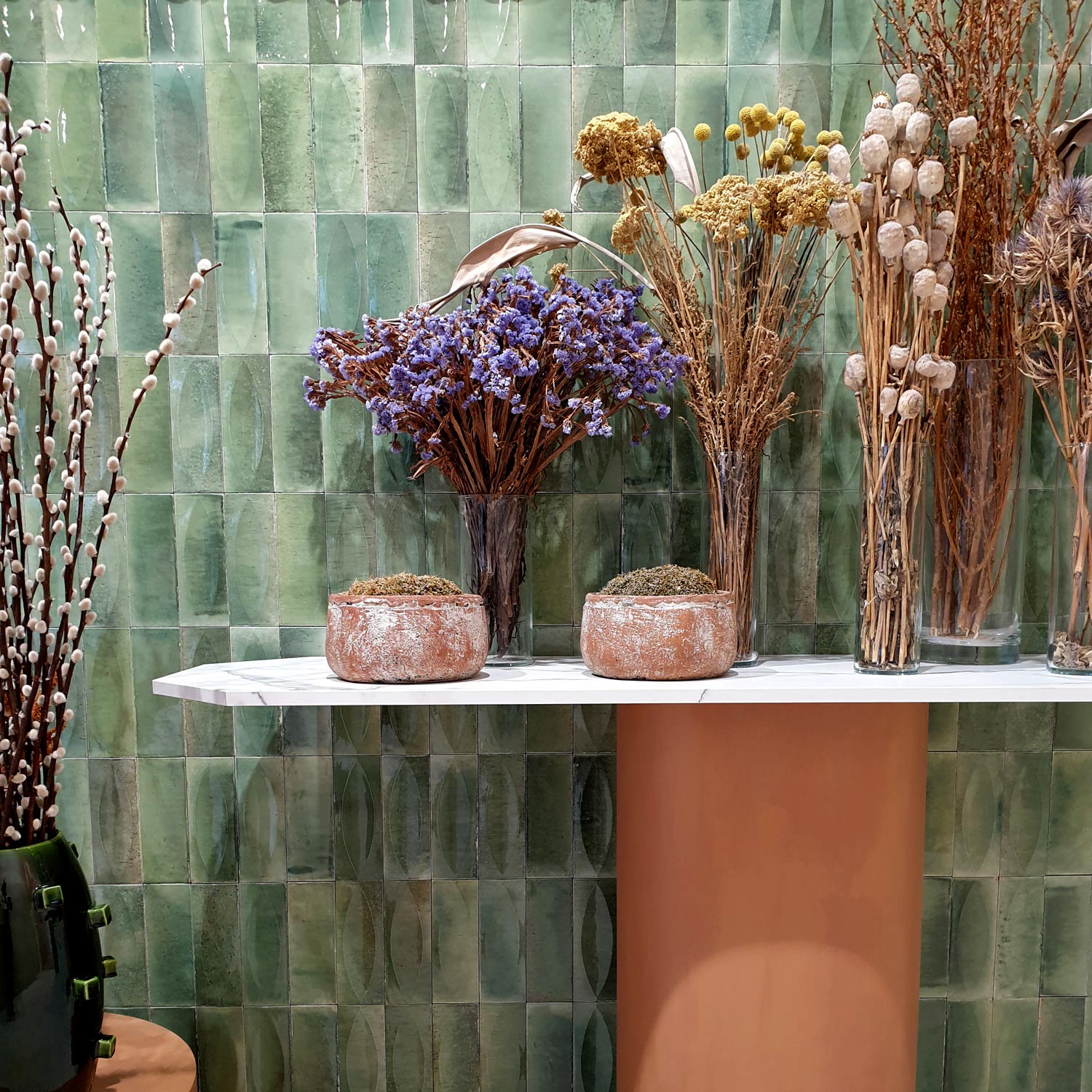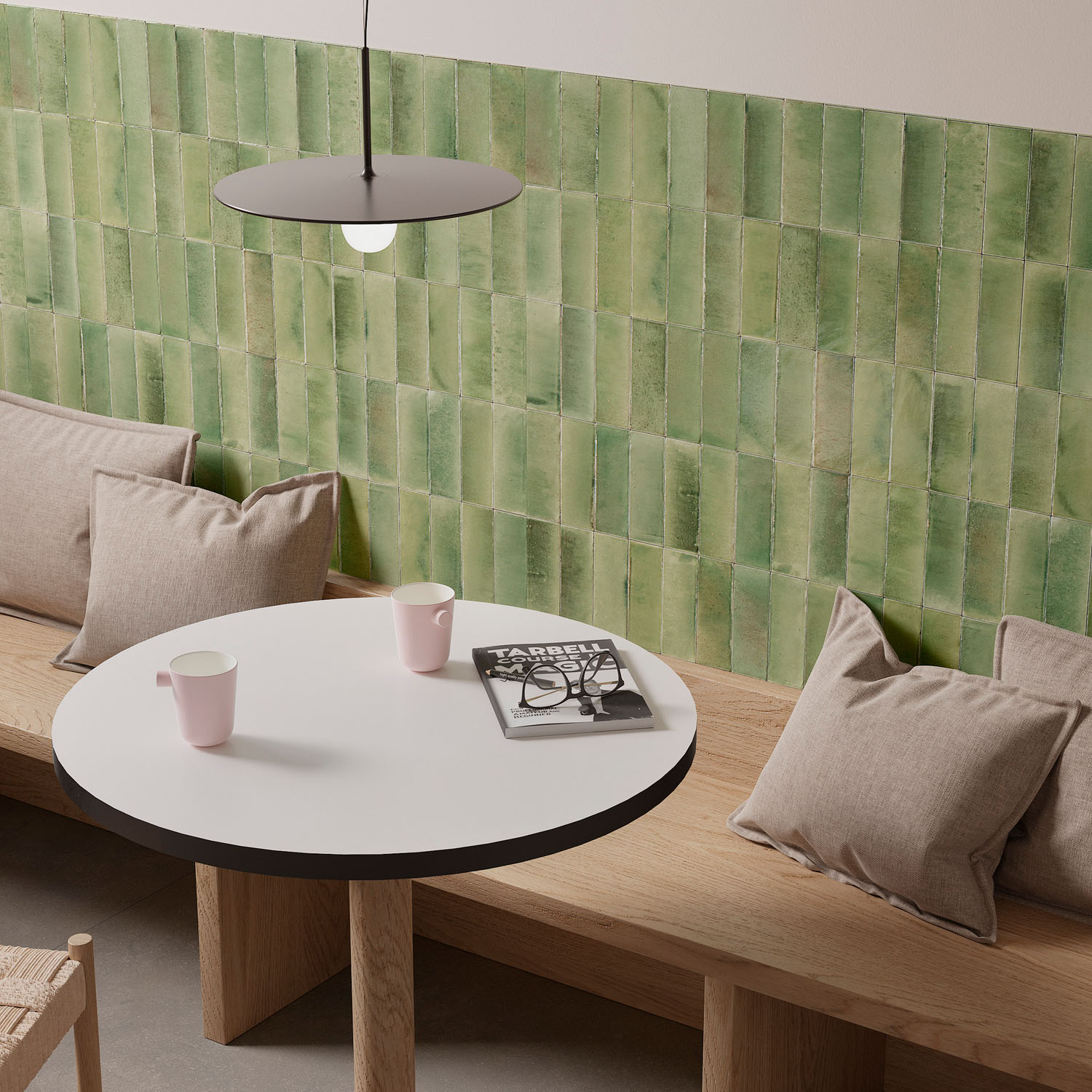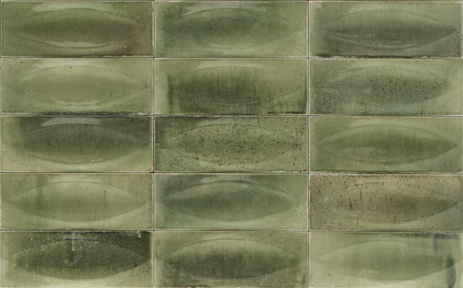 Superglansiga konkava och konvexa ytor i kombination med tredimensionella strukturer växlar på väggarna och ger dem liv. En palett av färger och storlekar. Plattorna är modulbaserade och med raka kanter för många sättningsalternativ.